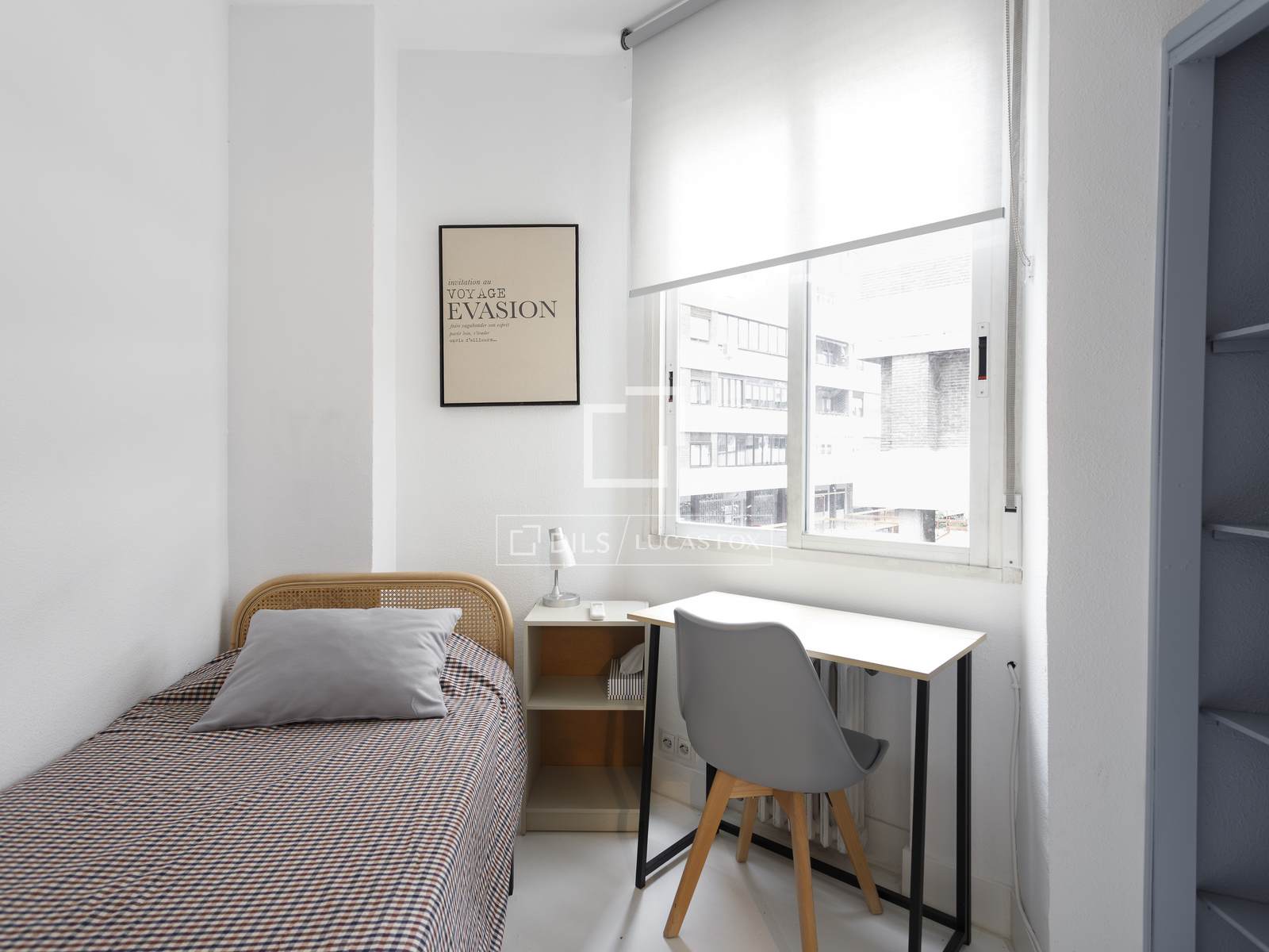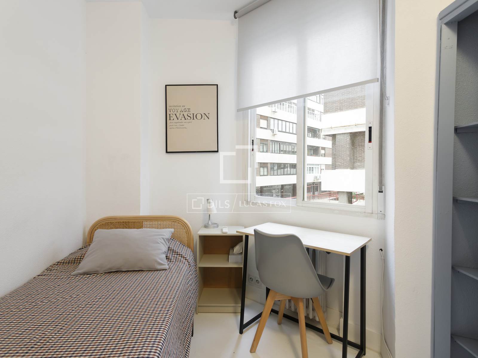De hal geeft toegang tot een ruime en lichte woon-eetkamer, volledig gemeubileerd en ontworpen om een uitnodigende en elegante ruimte te creëren, ideaal voor zowel ontspanning als gezelligheid. Vanuit hier bereikt u de tweede slaapkamer, voorzien van inbouwkasten en een bed van 0,90 x 200 cm, perfect als logeerkamer, kantoor of gastenkamer.
