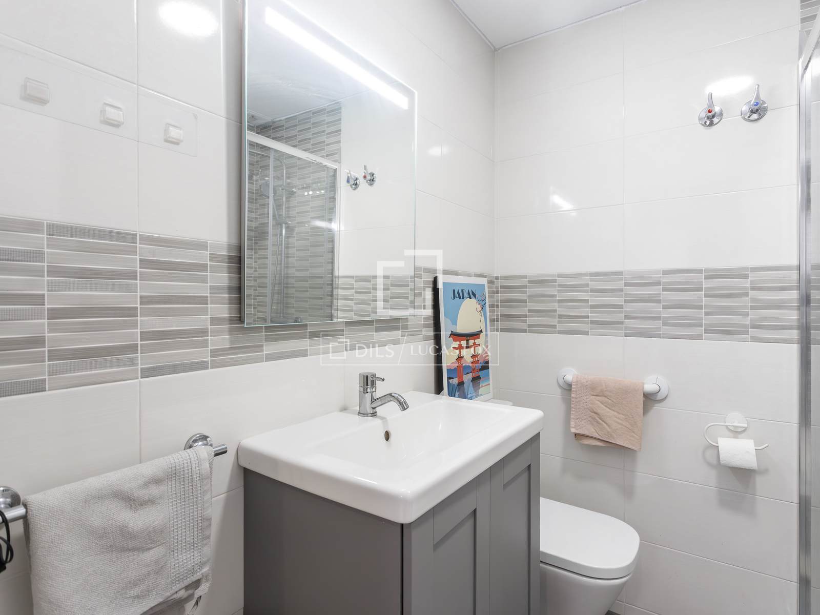 Rechts bevindt zich een recent gerenoveerde badkamer met douche, waar het eigentijdse design en de hoogwaardige materialen een moderne en verfijnde sfeer creëren. In deze ruimte bevindt zich ook een doordacht ontworpen eerste slaapkamer met een bed van 140 x 200 cm en ingebouwde kledingkasten, die comfort en voldoende opbergruimte bieden.