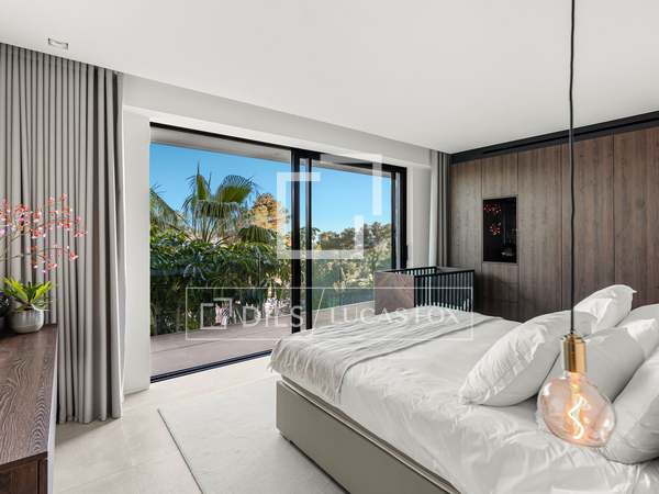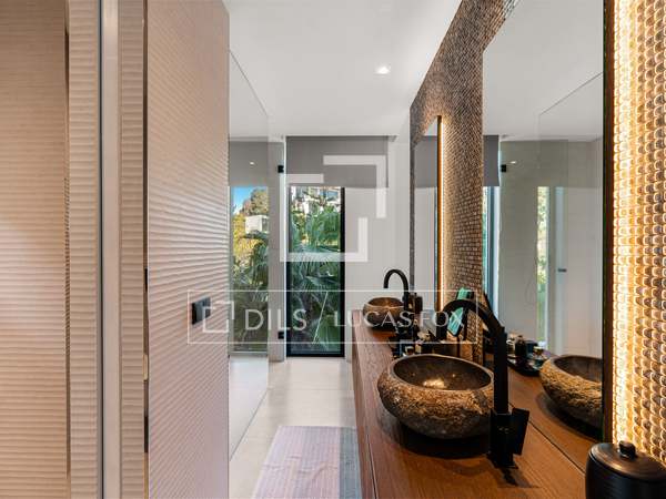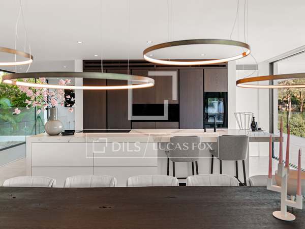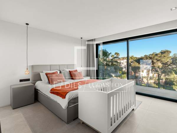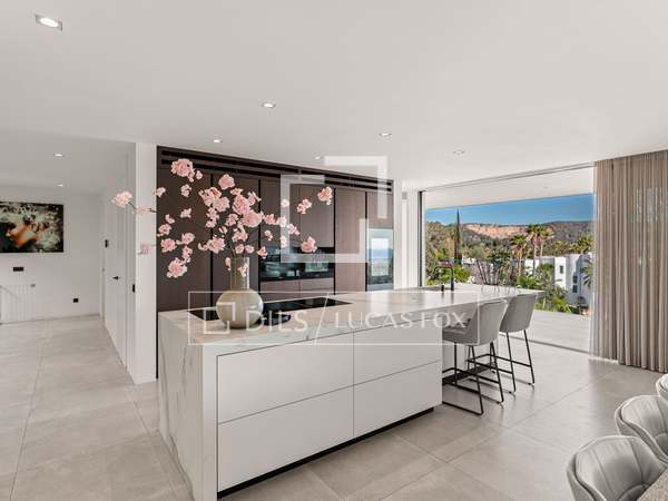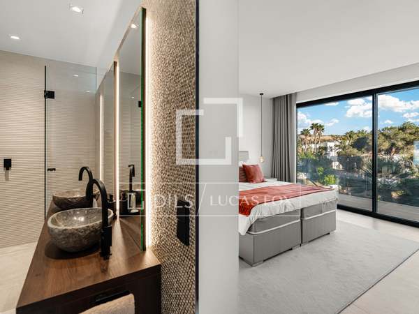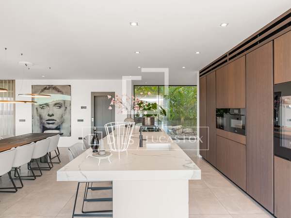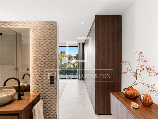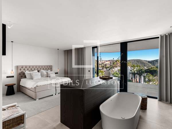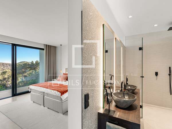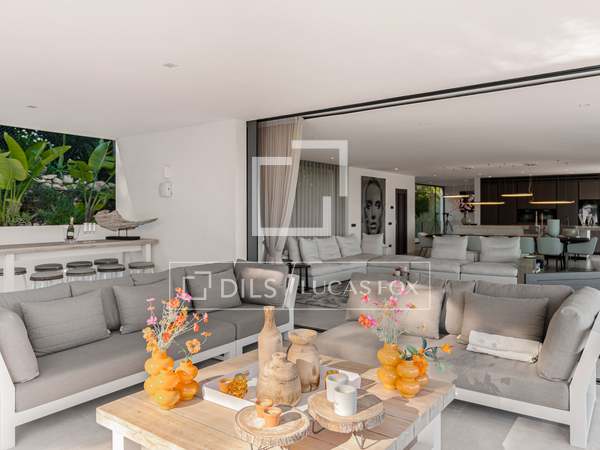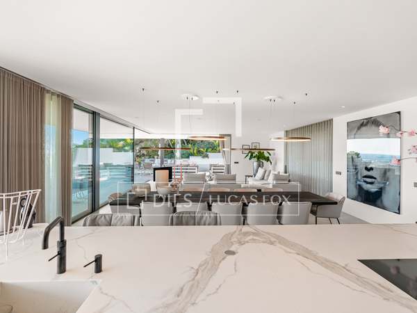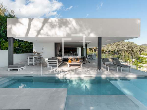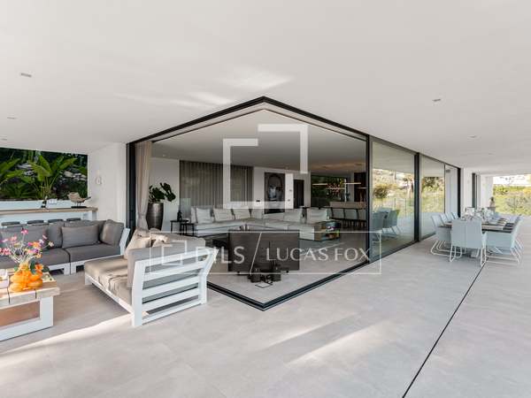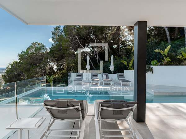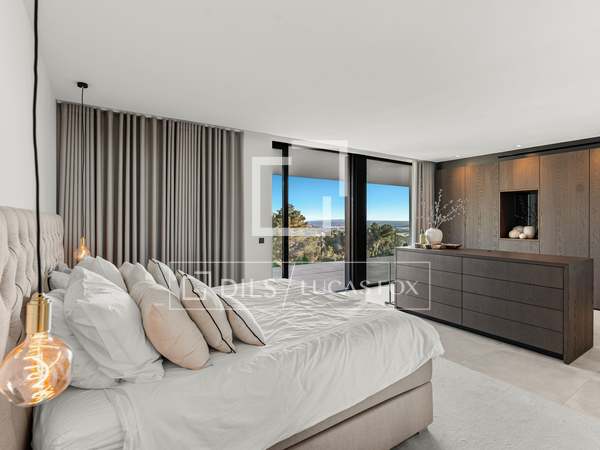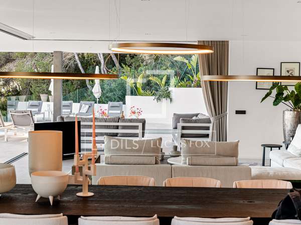 Als u vanuit de garage naar de villa afdaalt, wordt u direct begroet door een adembenemend uitzicht op zee, met het eiland Formentera aan de horizon. Rechts vindt u een ruime woonkamer en een van de master suites. Links leiden de keuken en eetkamer naar twee extra slaapkamers, met een tweede master suite aan het uiteinde. Het huis opent zich via uitgestrekte ramen van vloer tot plafond naar een overdekt terras van 70 m², dat naadloos aansluit op het indrukwekkende zwembad van 150 m².