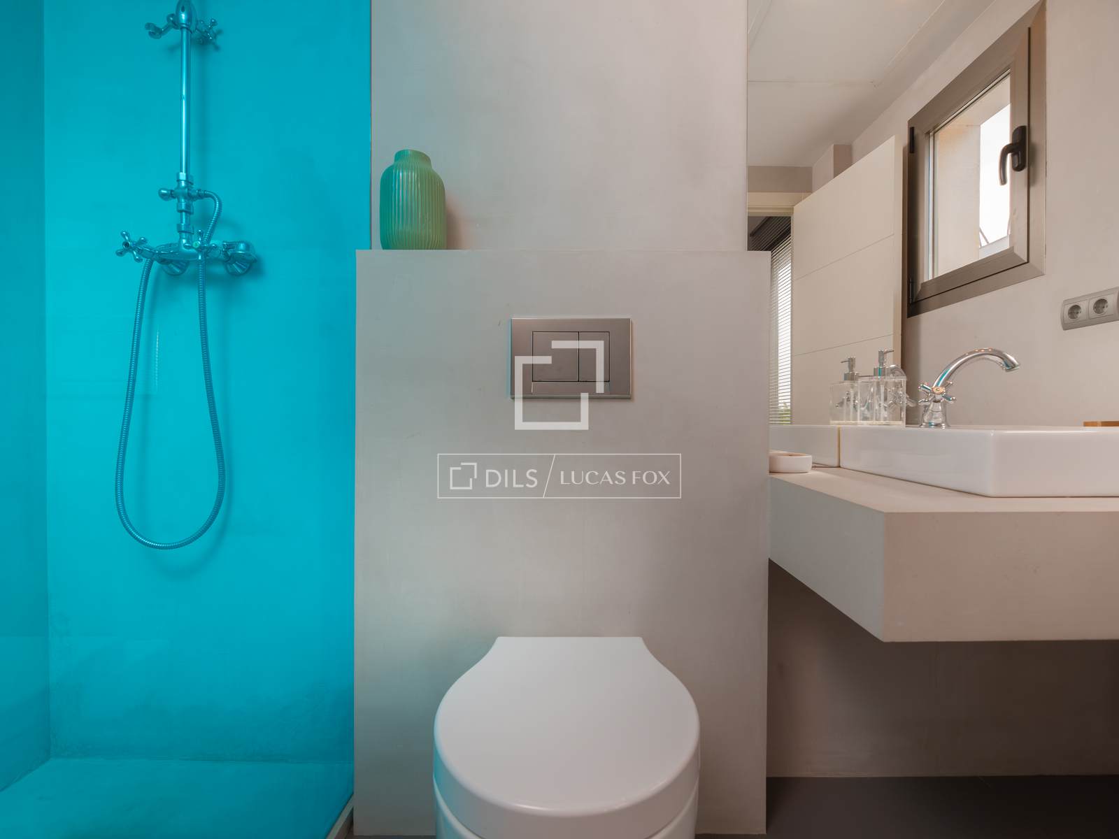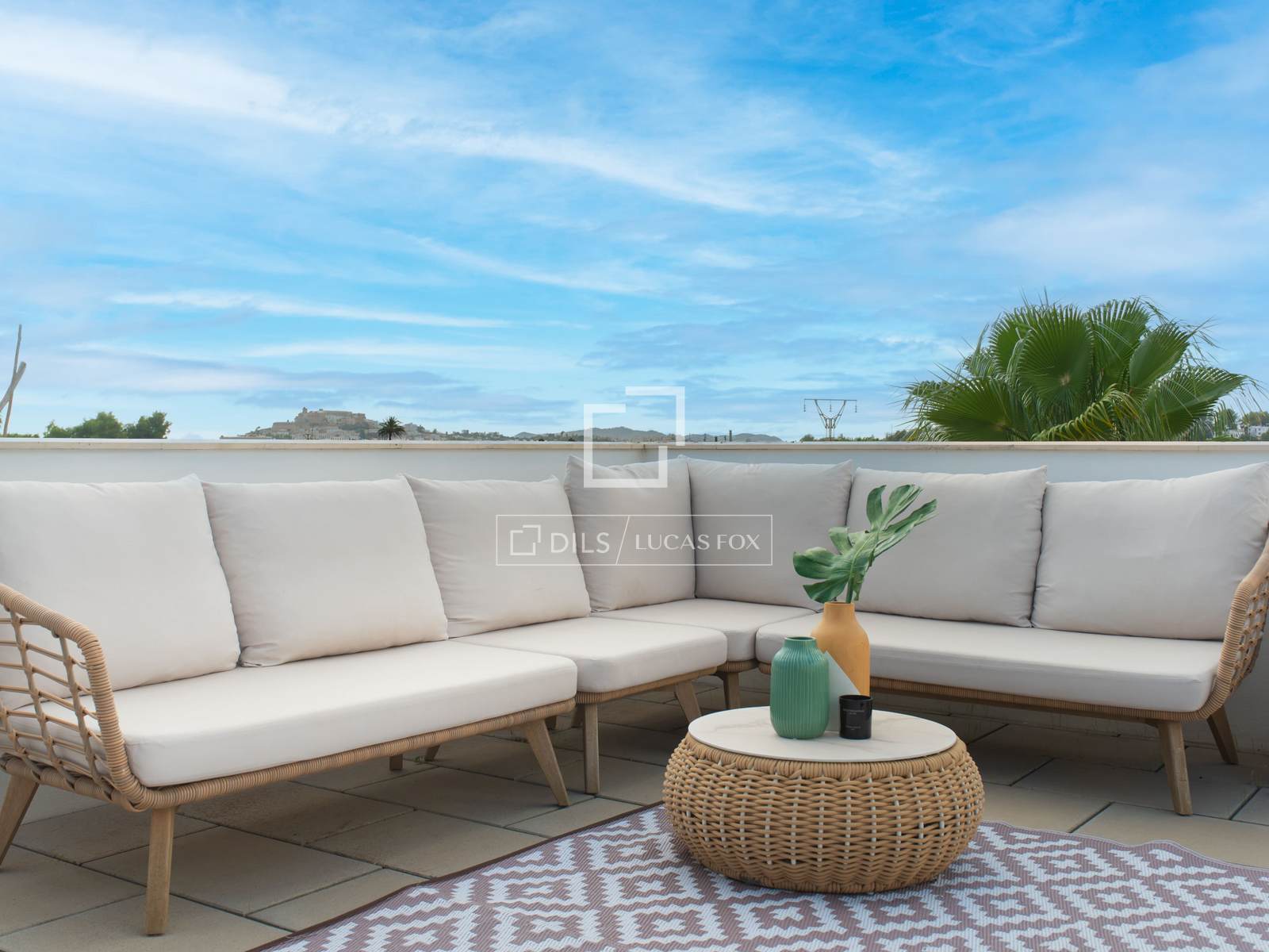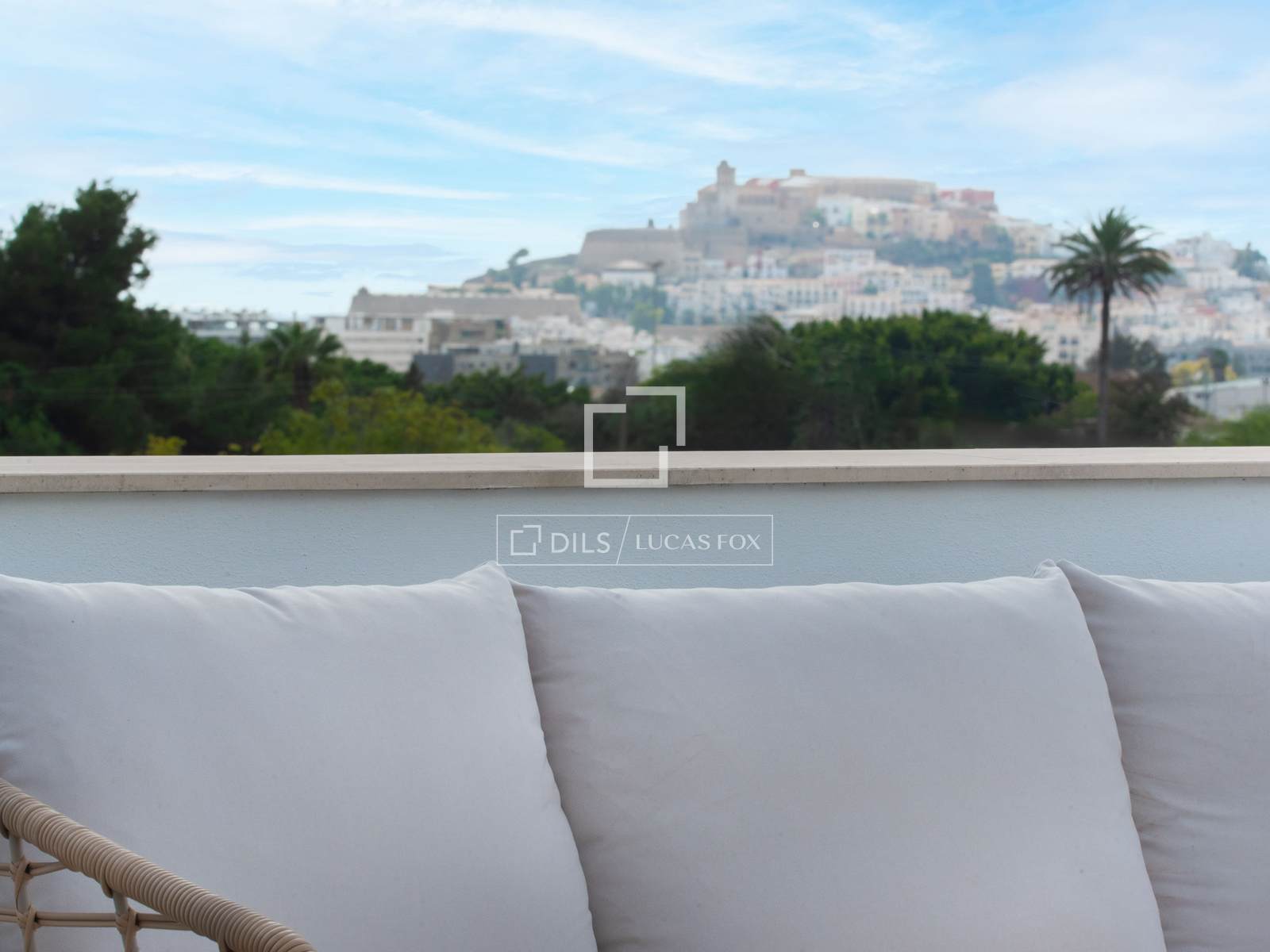 Een hoogtepunt van de woning is het ruime dakterras, met een open uitzicht over de omgeving en de herkenbare skyline van Dalt Vila in de verte. Deze verhoogde ruimte is perfect om te genieten van zonsondergangen, buiten te dineren of gewoon te ontspannen onder de mediterrane hemel.