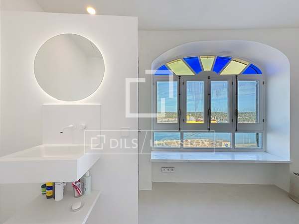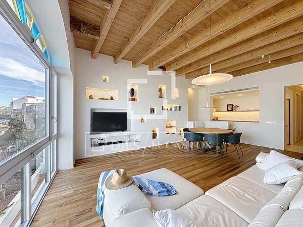 Het appartement heeft een modern, elegant en minimalistisch design met open ruimtes en witte tinten, evenals grote ramen die veel natuurlijk licht binnenlaten en een prachtig uitzicht op zee bieden.