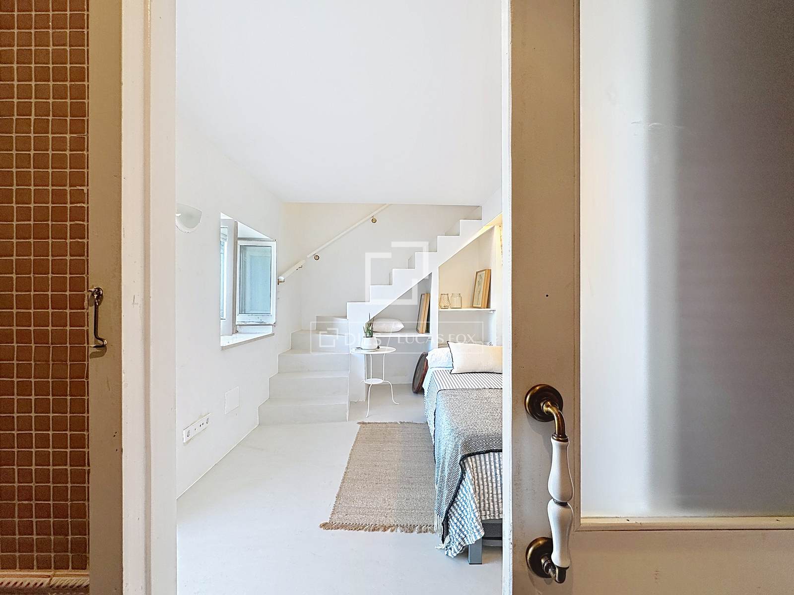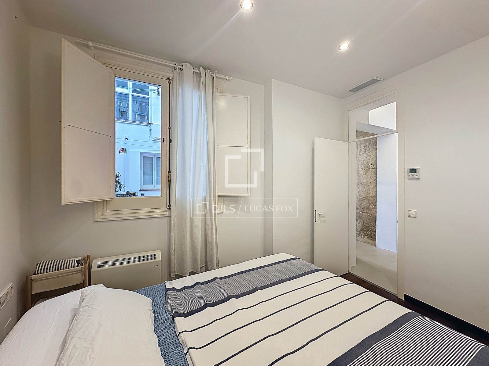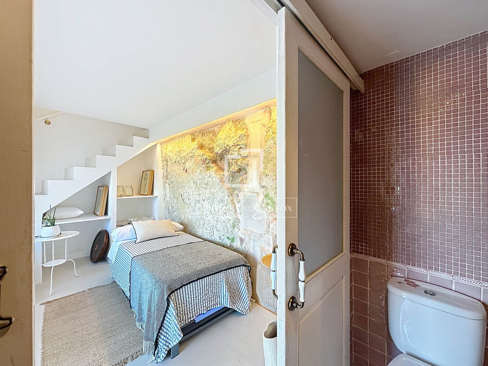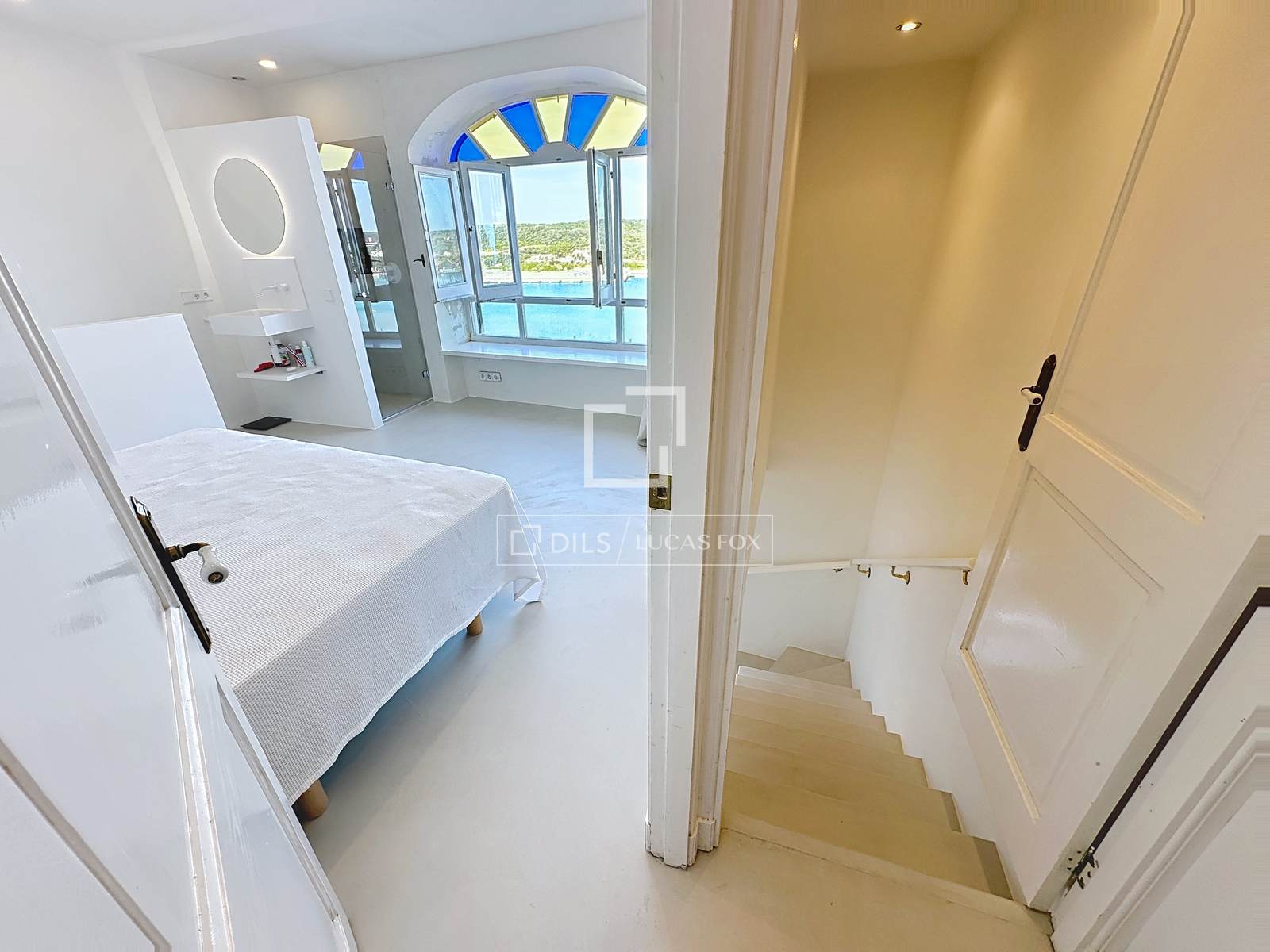 Als u de trap afdaalt, bereikt u de tweede slaapkamer met eigen badkamer. Deze ruimte valt op door de designbadkamer, die volledig is gerenoveerd en is voorzien van een douche met direct uitzicht op de haven door een groot boogvormig raam, dat bewaard is gebleven als eerbetoon aan het oorspronkelijke ontwerp dat typisch is voor Menorca.