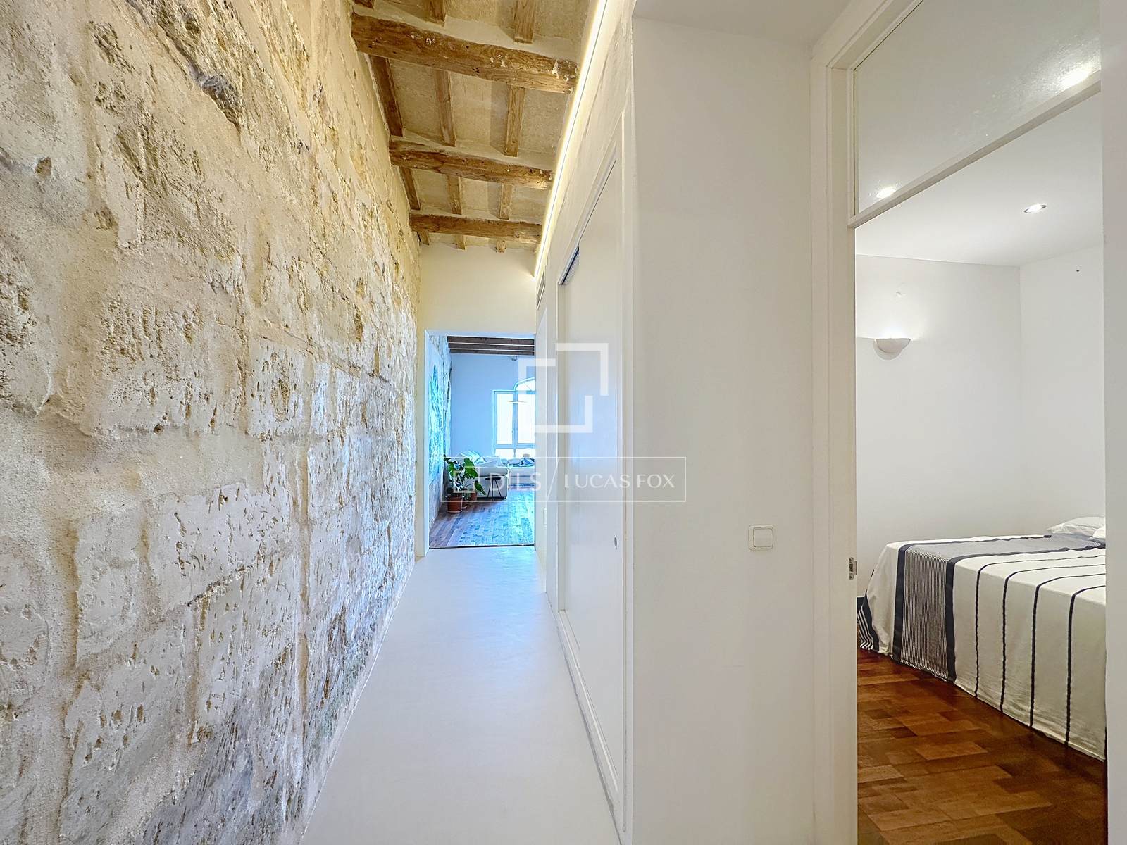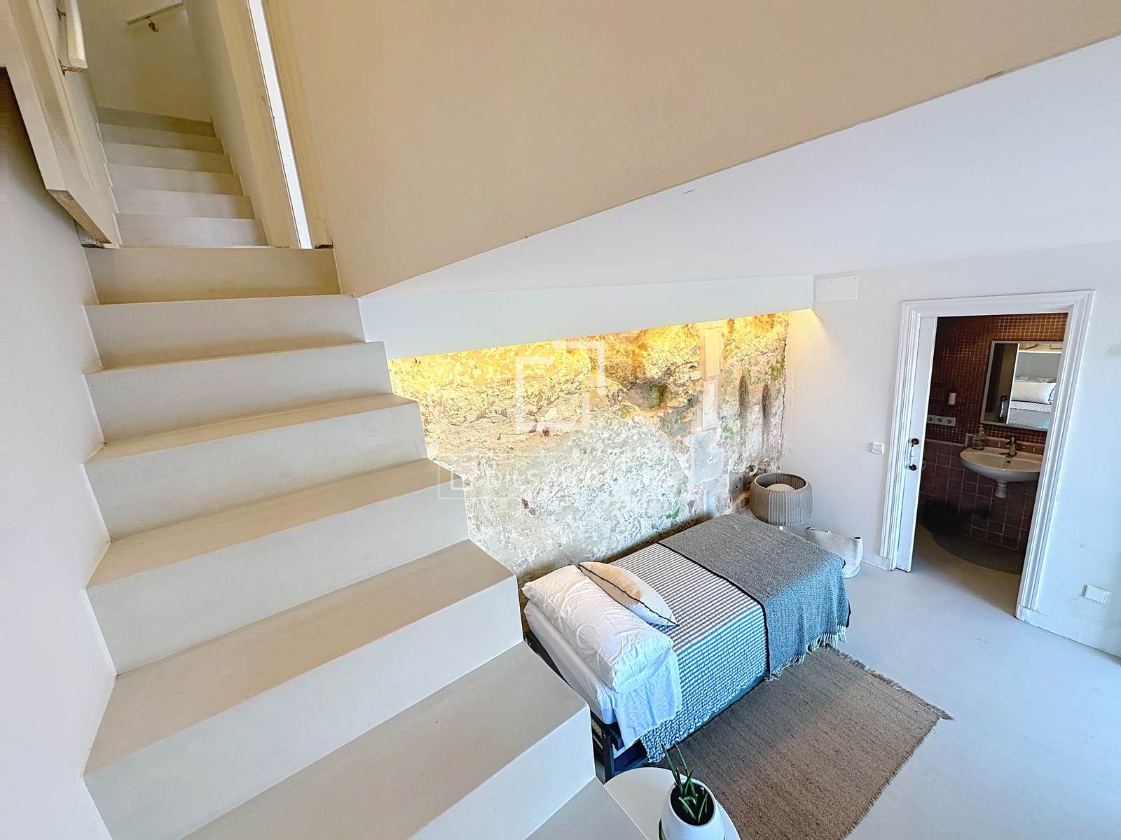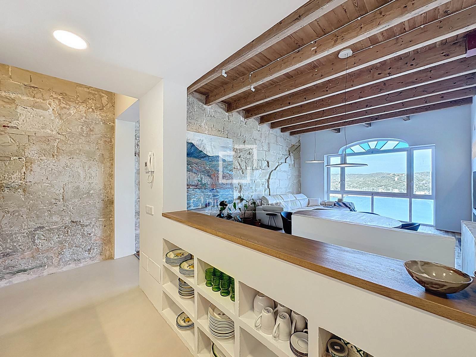 De woning is verdeeld over drie verdiepingen en beschikt over drie slaapkamers en drie badkamers. Op de begane grond, het hoogste niveau van het huis, bevindt zich een indrukwekkende woonkamer die baadt in natuurlijk licht en een onbelemmerd uitzicht biedt op de haven van Maó. De ruimte is bijzonder opvallend door de zorgvuldig samengestelde esthetiek: een originele muur van marés-steen en een andere met verlichte nissen die de sfeer van een kunstgalerie oproepen. Op deze verdieping bevindt zich tevens een gloednieuwe keuken met strakke lijnen en een eigentijds design, open naar de woonkamer en met uitzicht op zee, evenals een slaapkamer met uitzicht op een rustige binnenplaats en een complete badkamer met ligbad.