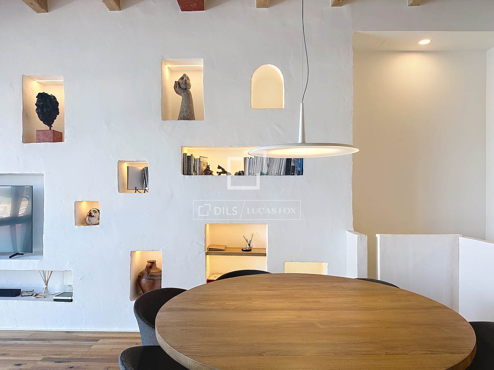 Het huis is volledig gerenoveerd met een verfijnde smaak, waarbij gekozen is voor een minimalistische en elegante stijl die de traditionele Menorcaanse architectuur respecteert en originele materialen zoals marés-steen, zichtbare houten balken en elementen die typerend zijn voor huizen uit het begin van de twintigste eeuw benadrukt.