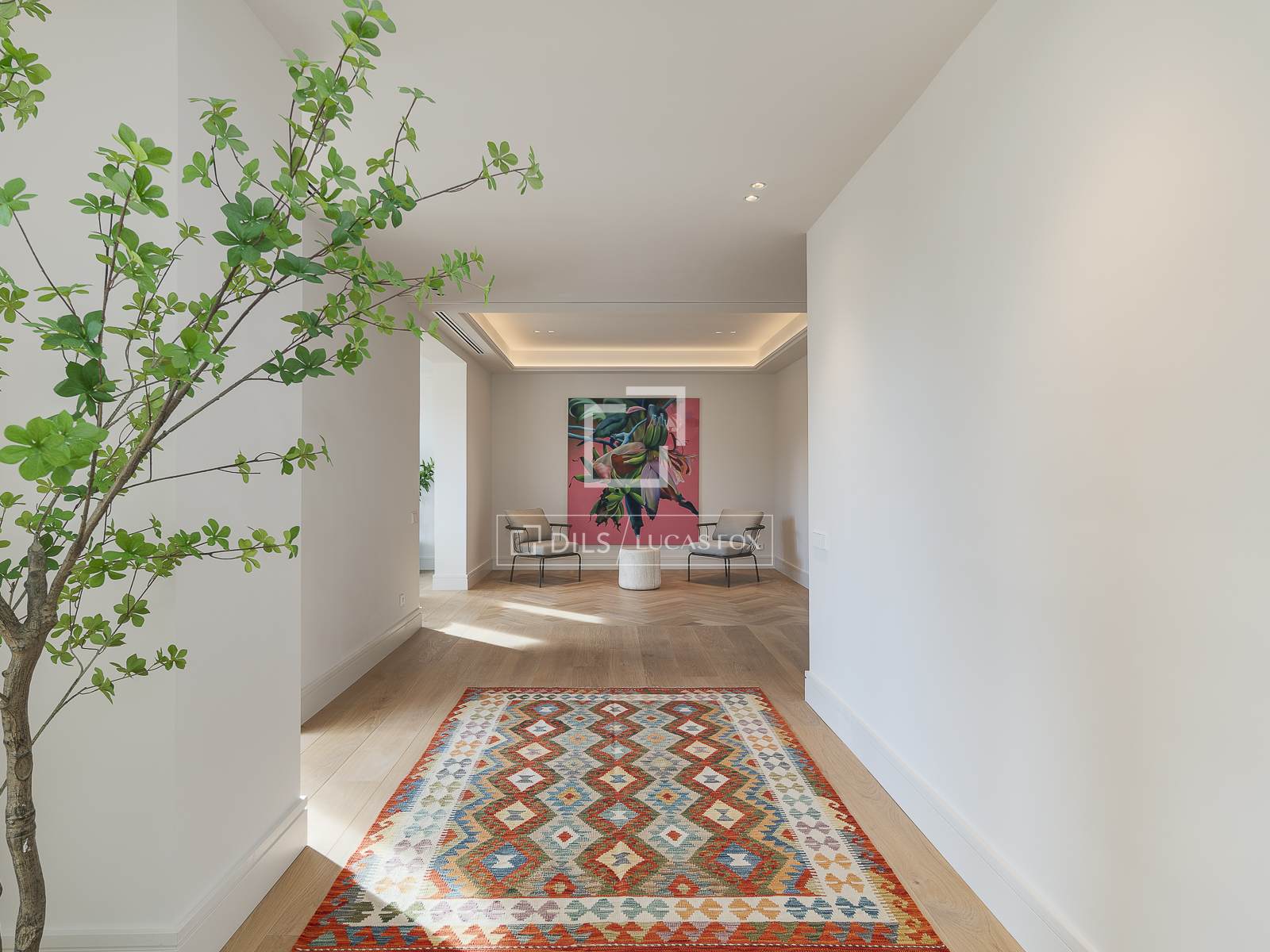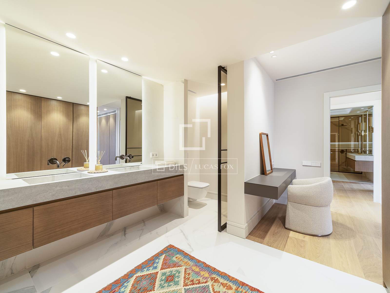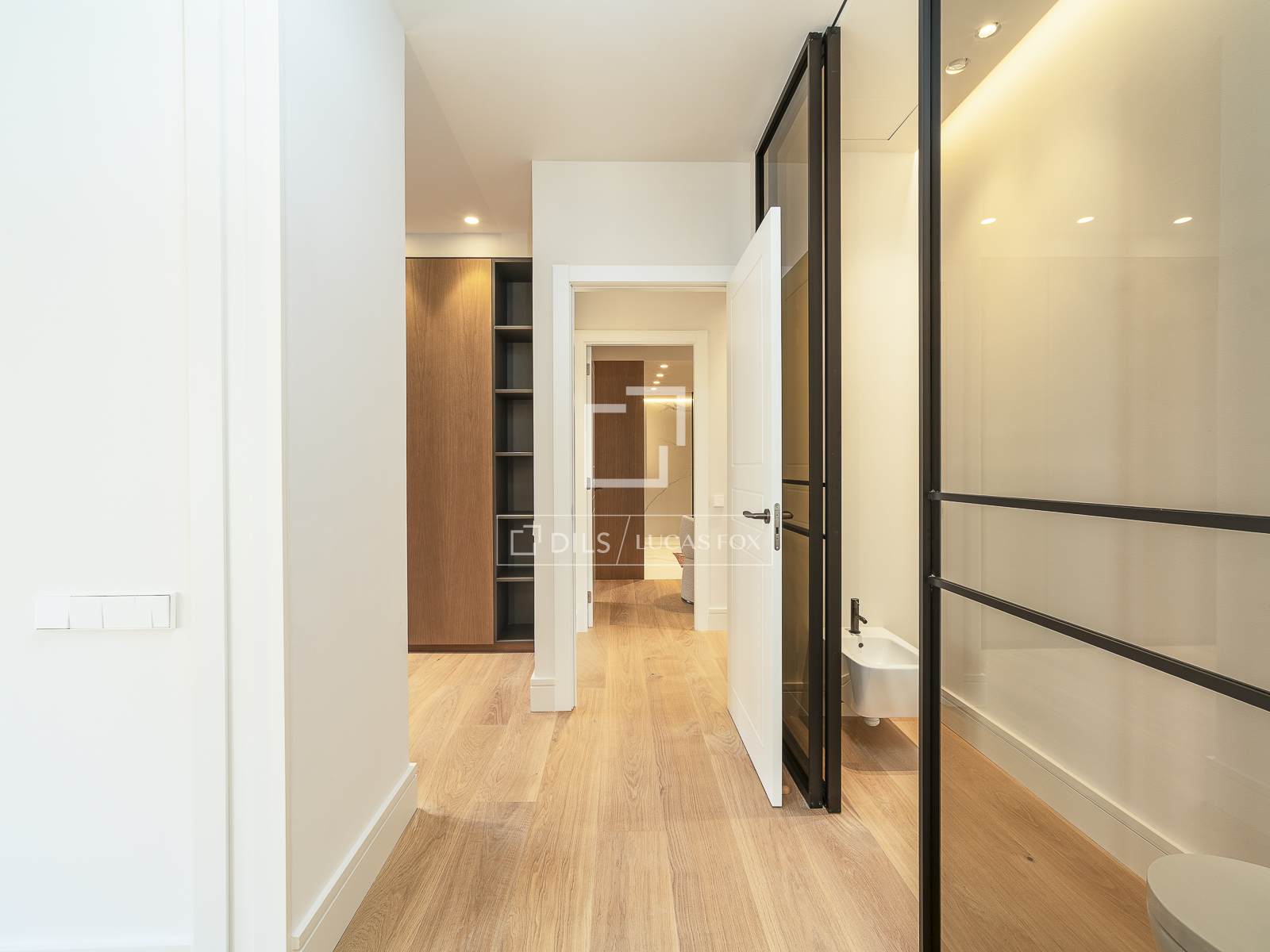 De elegante en functionele hal beschikt over voldoende opbergruimte en een discreet gastentoilet, evenals toegang tot een van de suites.