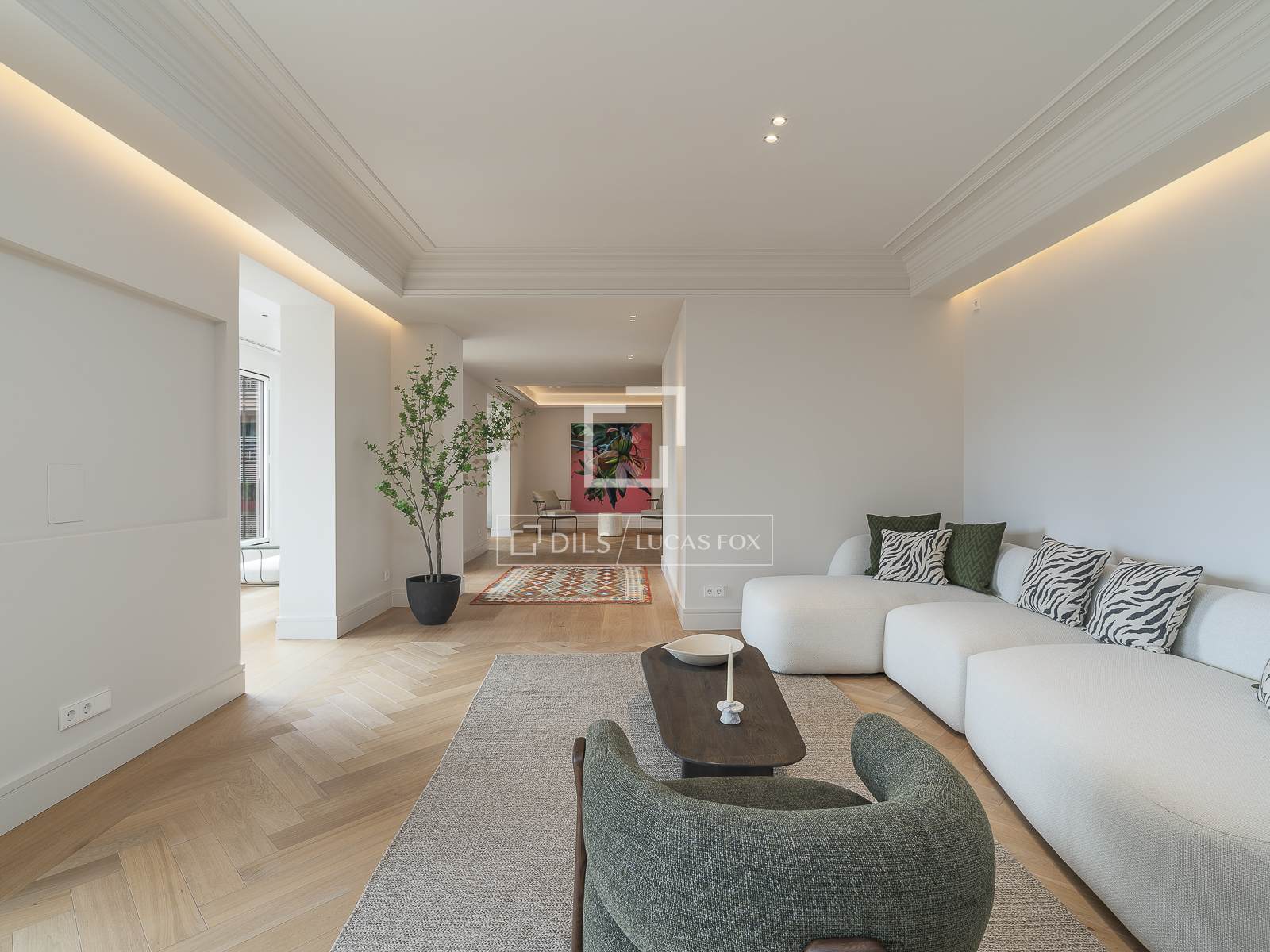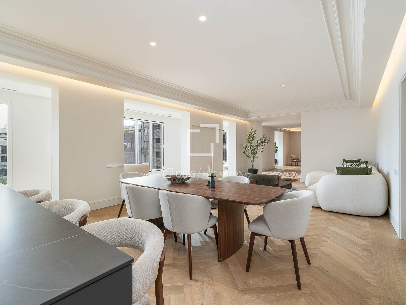 Het daggedeelte, op het zuidoosten gericht, biedt een bevoorrecht uitzicht op de tuinen van het Mandarin Hotel. Bovendien beschikt het over een majestueuze open ruimte van meer dan 110 m², die een woonkamer, eetkamer en een spectaculaire open keuken met een groot kookeiland integreert.