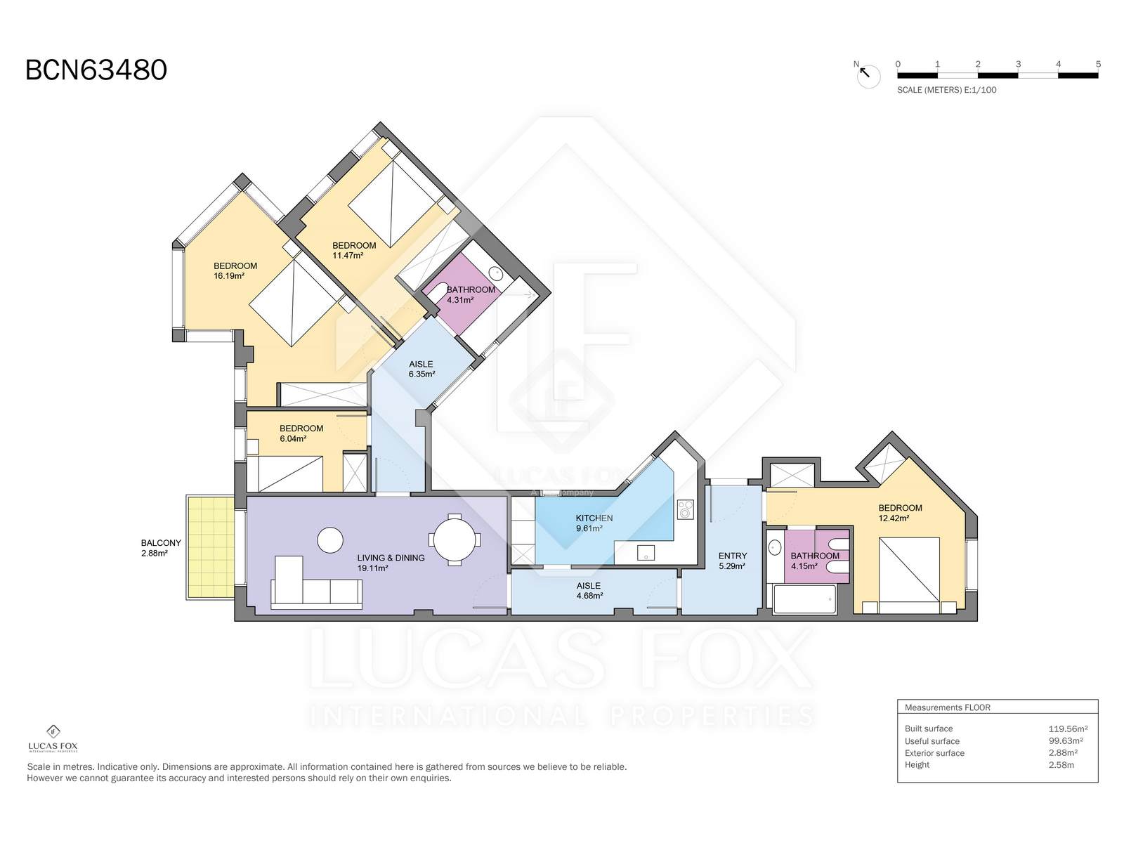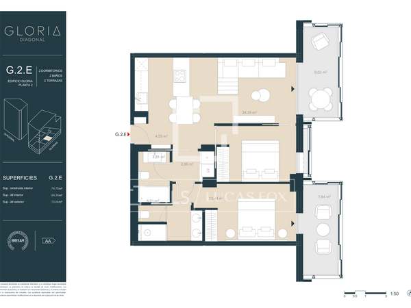 De woning biedt een bebouwde oppervlakte van 122 m² met een evenwichtige indeling die is ontworpen om ruimte en natuurlijk licht te maximaliseren. De ruime woon-/eetkamer komt uit op een zonnig balkon met open uitzicht over de stedelijke omgeving, de perfecte setting om te genieten van de mediterrane sfeer van Poblenou. De ruime en functionele keuken grenst aan een binnenpatio die de woning nog meer licht en functionaliteit geeft.