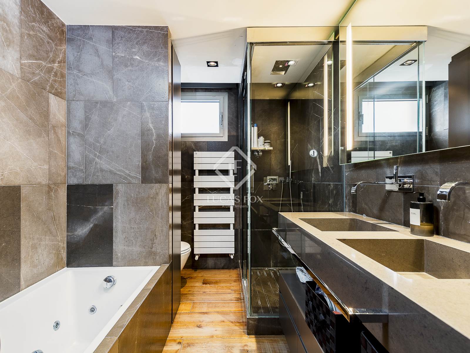 Bij binnenkomst treft u een hal die de ruimtes elegant organiseert. Aan de linkerkant bevindt zich een woonkamer van bijna 50 m² met kamerhoge ramen die uitkomen op een terras van 30 m², waardoor binnen en buiten naadloos in elkaar overlopen en er licht en een aangenaam ruimtelijk gevoel ontstaat. Aan de overkant combineert de perfect ontworpen keuken, uitgerust met Gaggenau-apparatuur, functionaliteit en elegantie. Aangrenzend aan deze ruimte bevinden zich een serviceruimte en een aparte wasruimte met een Miele-wasmachine en -droger. De dienstbodekamer heeft een eigen badkamer en douche.