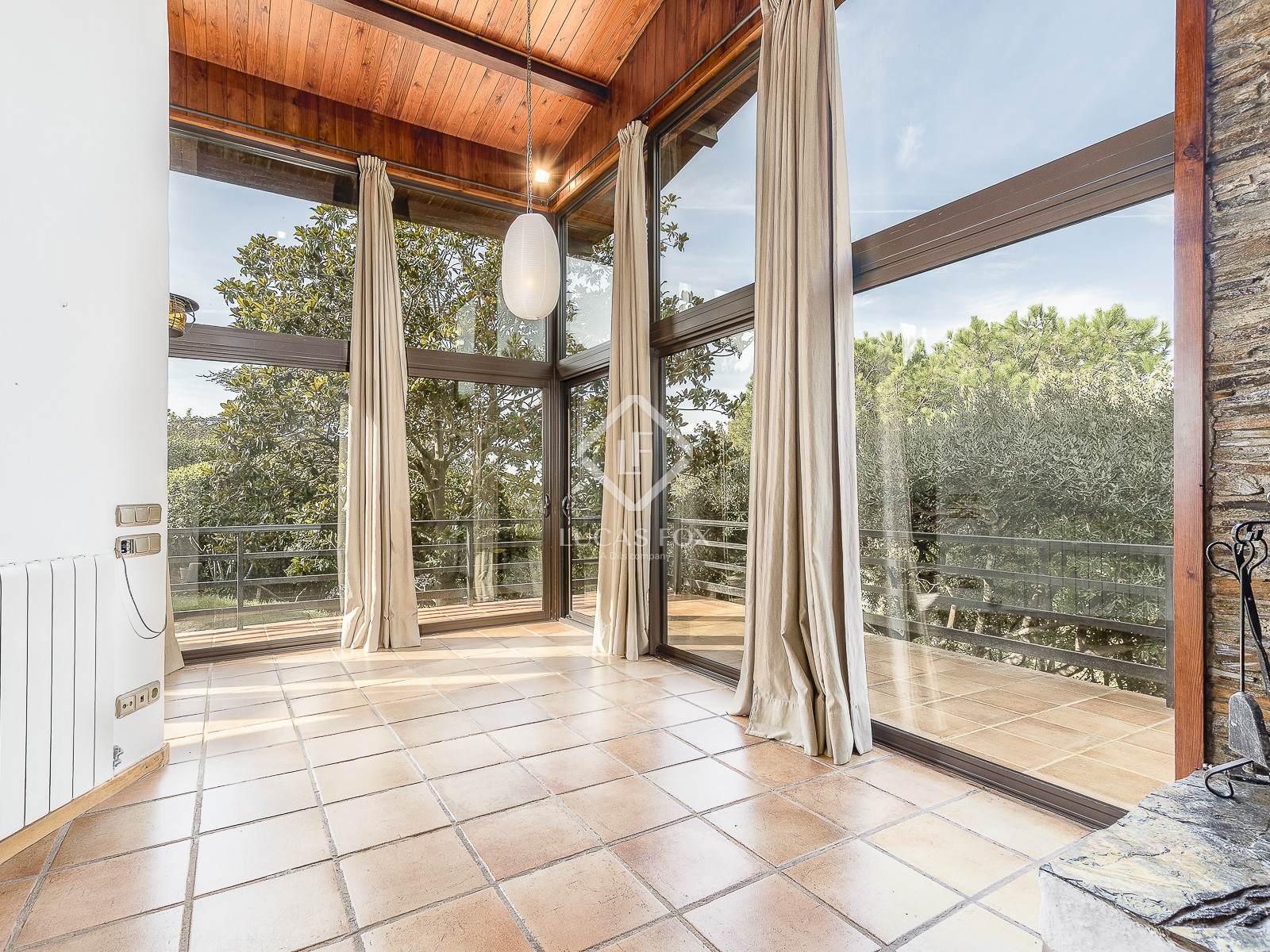 Het hoofdhuis valt op door de indrukwekkende woonkamer met dubbele hoogte, houten plafonds en zichtbare balken, stenen muren en enorme glazen oppervlakken die direct in verbinding staan met de boomtoppen. Hierdoor ontstaat het gevoel van een moderne oase midden in de bergen. De ruimtes overdag komen uit op een terras met uitzicht op het groen en de slaapkamers genieten van totale rust en licht. Sommige hebben prachtige Catalaanse gewelfde plafonds die karakter en warmte toevoegen.