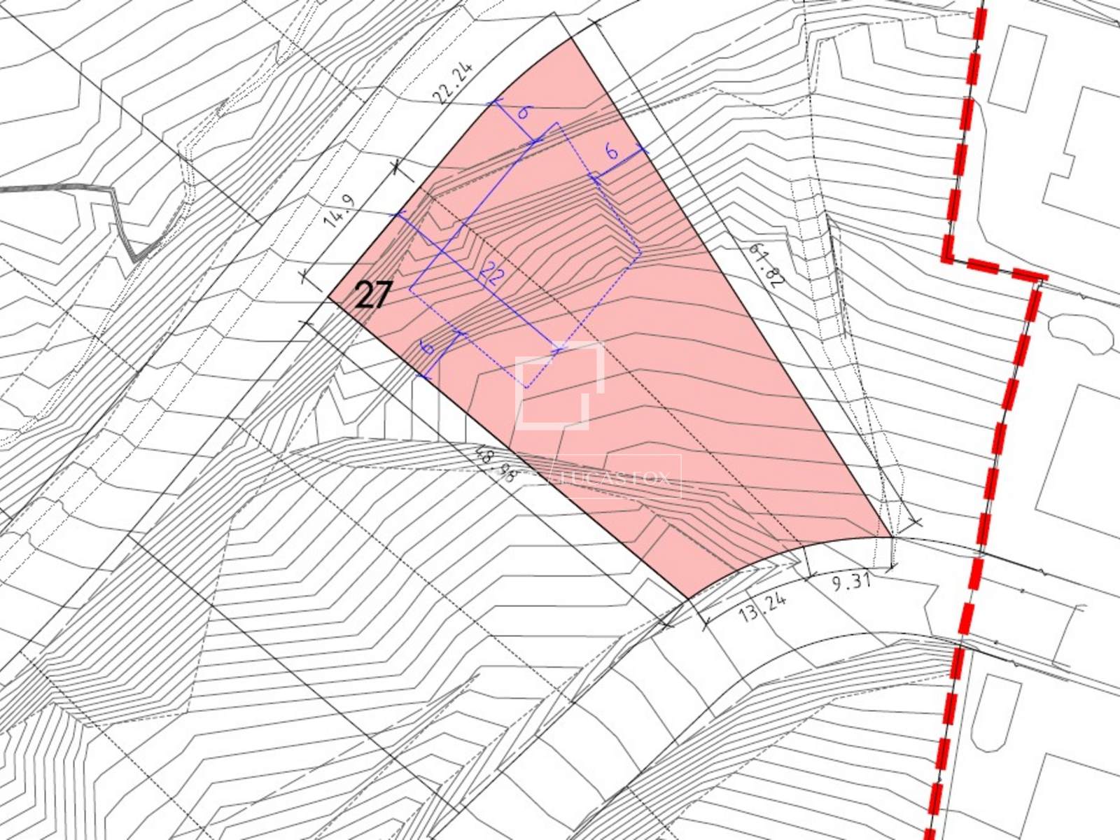 Het perceel heeft een oppervlakte van 1.566 m², is op het zuidoosten georiënteerd en geniet daardoor van veel zon, en biedt een onbelemmerd uitzicht op de zee en de bergen.