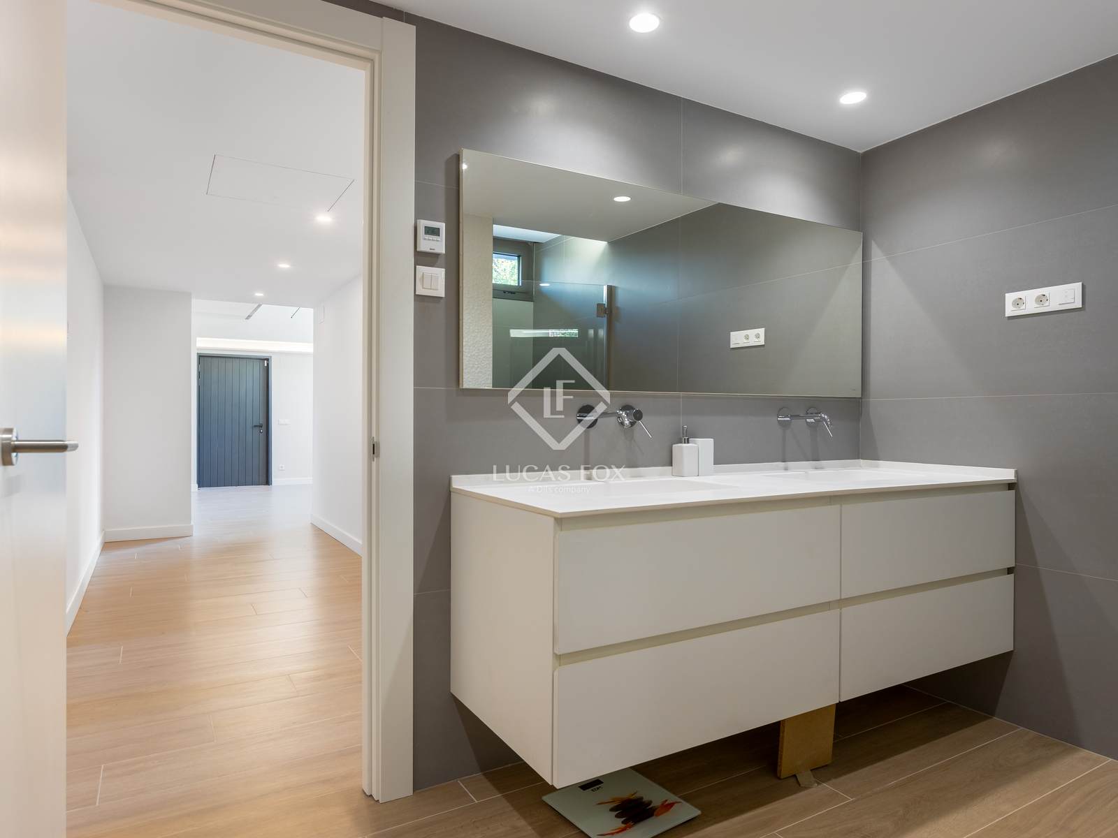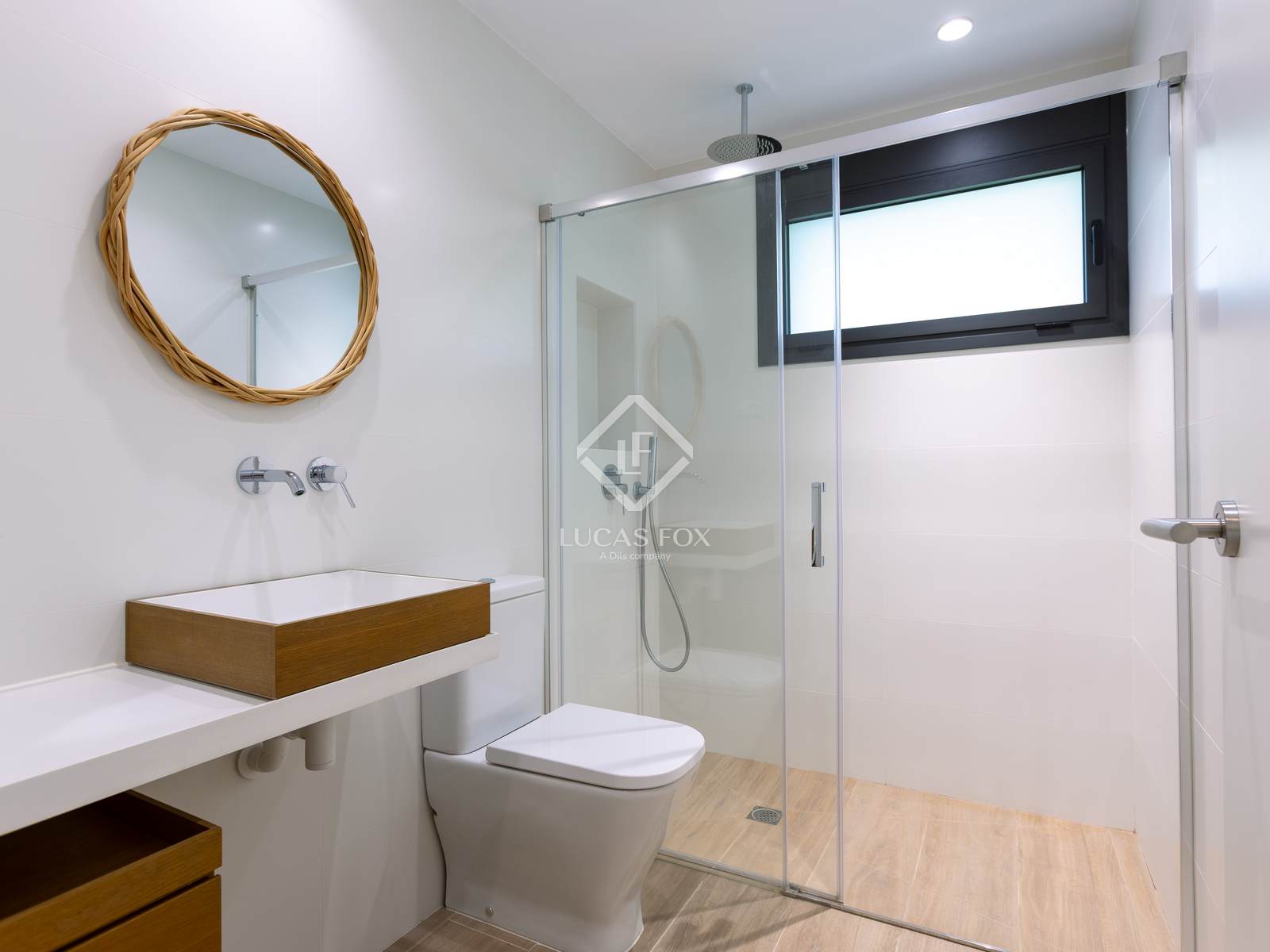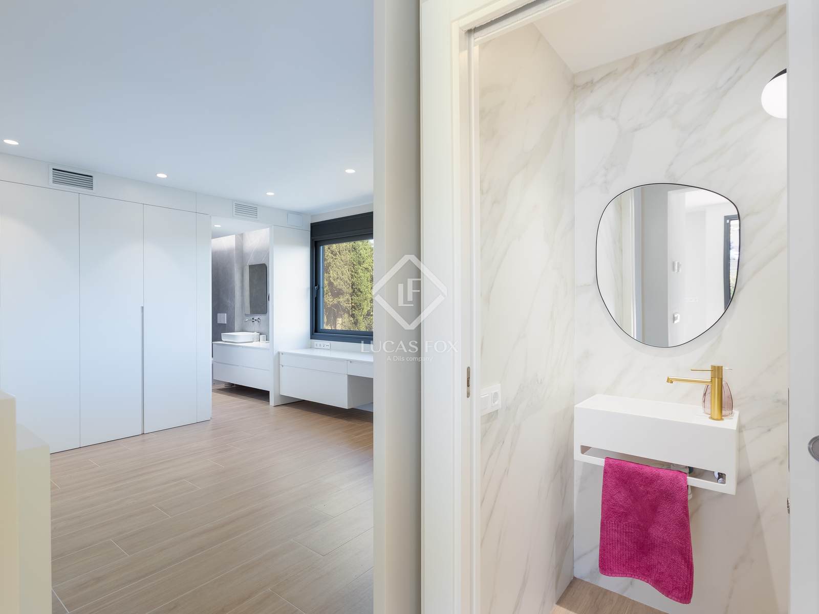 In het slaapgedeelte vinden we vier ruime tweepersoonsslaapkamers, waarvan twee met inloopkasten en een eigen badkamer, en twee extra slaapkamers die een complete badkamer delen. De badkamers zijn ontworpen met grote porseleinen tegels, regendouches en antislipvloeren die passen bij de rest van het huis.
