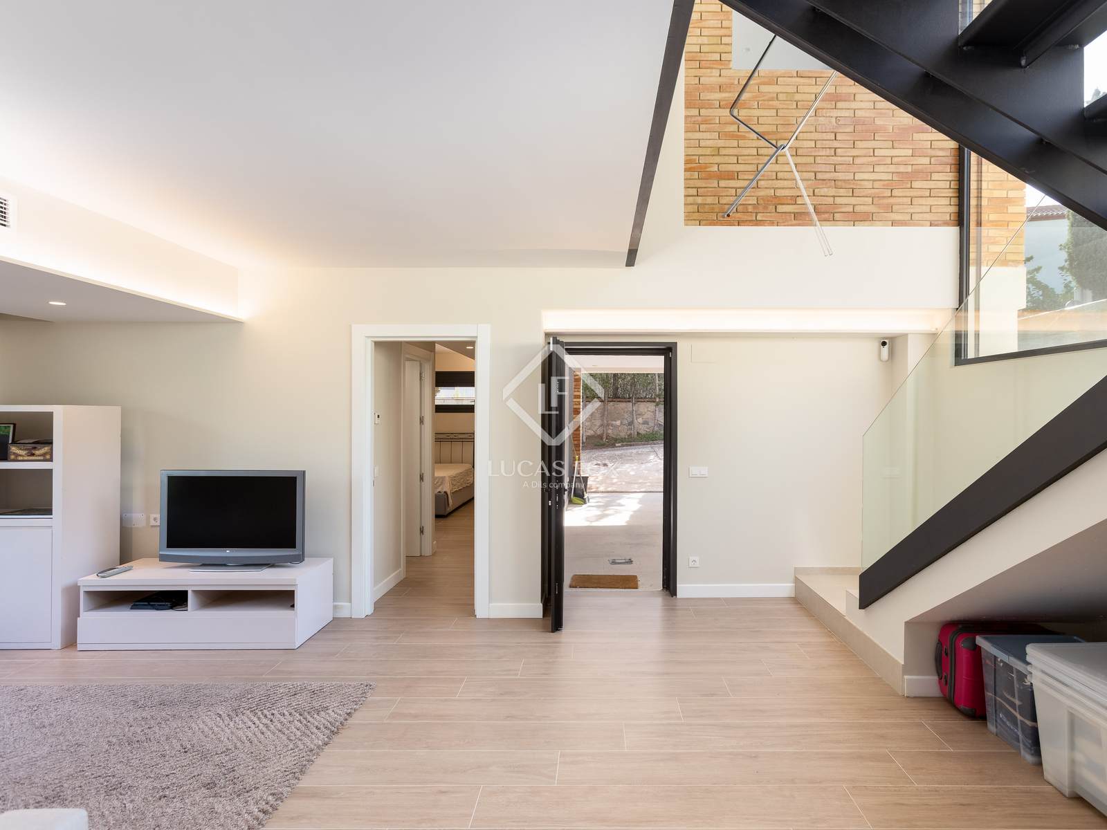 Op de benedenverdieping bevinden zich een speelkamer of multifunctionele ruimte, een opslagruimte, een machinekamer en een parkeerplaats met capaciteit voor meerdere voertuigen, voorzien van vooraf geïnstalleerde elektrische laadstations.