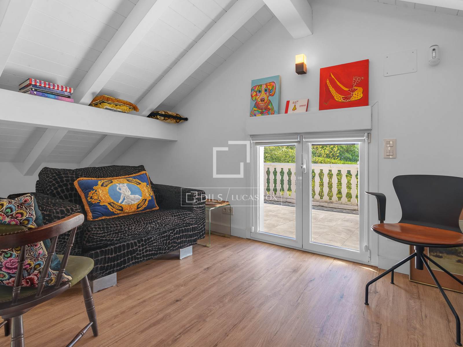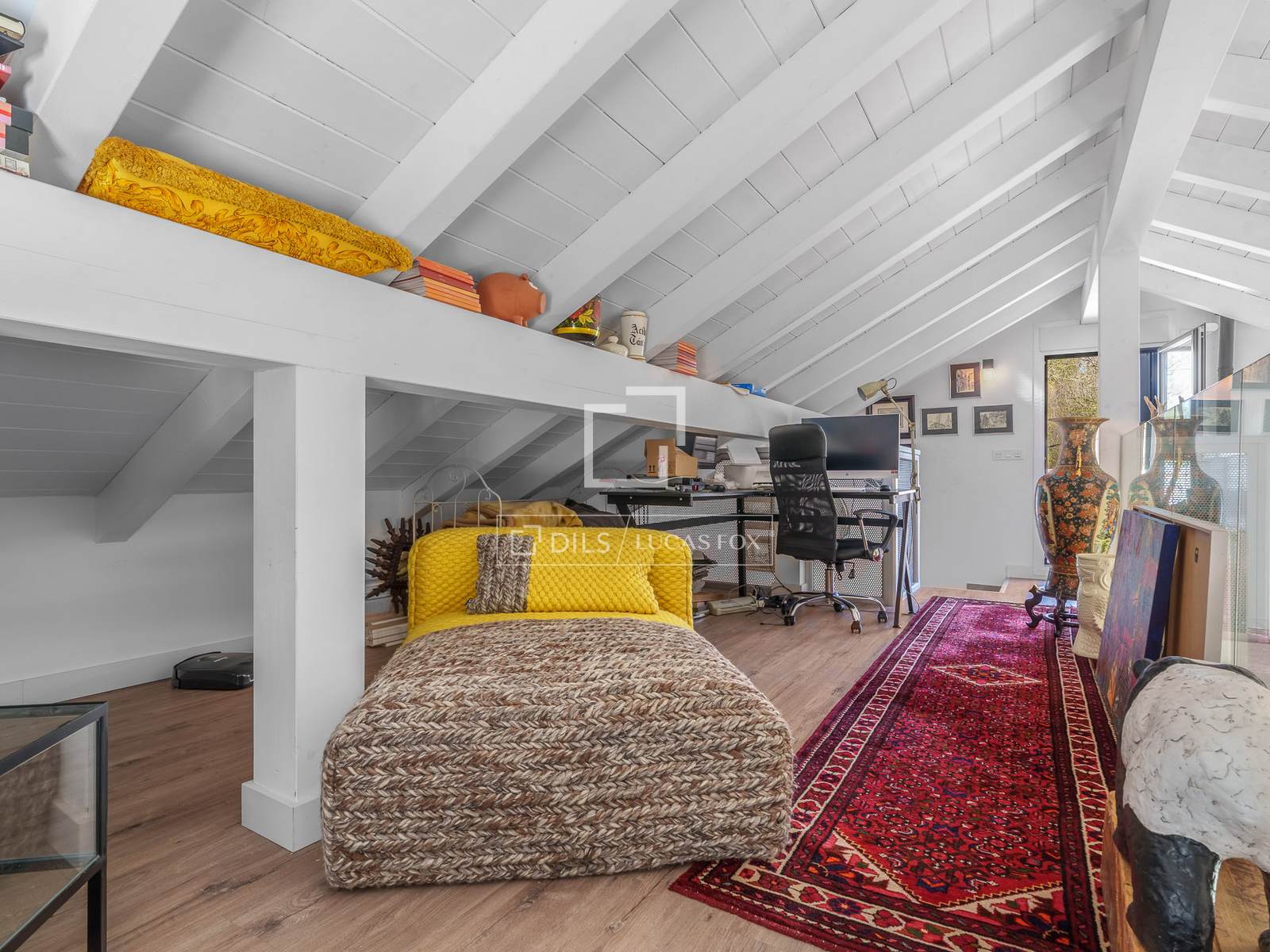 De eerste verdieping is een chill-outruimte op zolder, met banken en een televisie, die leidt naar een groot terras op het zuiden.