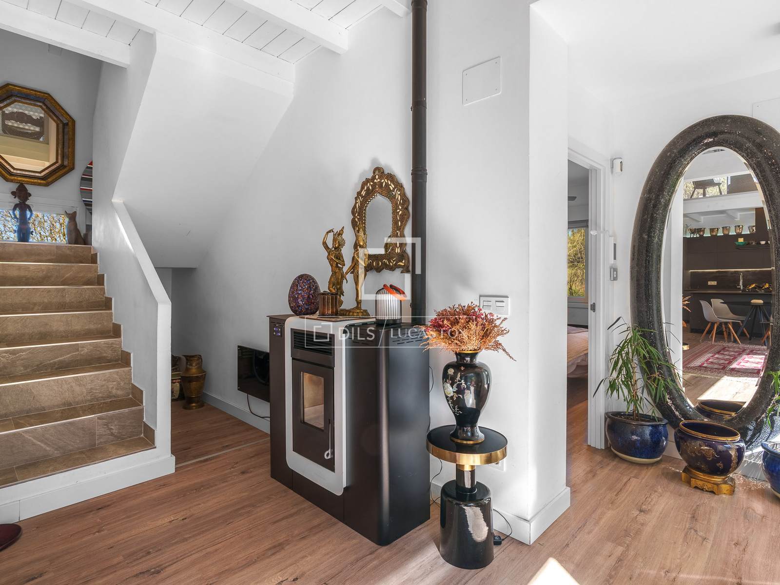Op de eerste verdieping een ruime ruimte van 40 m² met een moderne, volledig uitgeruste keuken met hoogwaardige Bosch-apparatuur: inductiekookplaat, twee ovens (stoomoven om te bakken en een gewone oven), magnetron en vaatwasser. De keuken heeft voldoende opbergruimte en directe toegang tot een terras en tuin via grote ramen. De woonkamer is voorzien van een pellethaard met gerecyclede houtpellets voor duurzaam gebruik. Verwarming door het hele huis wordt verzorgd door energiezuinige radiatoren (één in elke slaapkamer) en elektrische handdoekverwarmers.