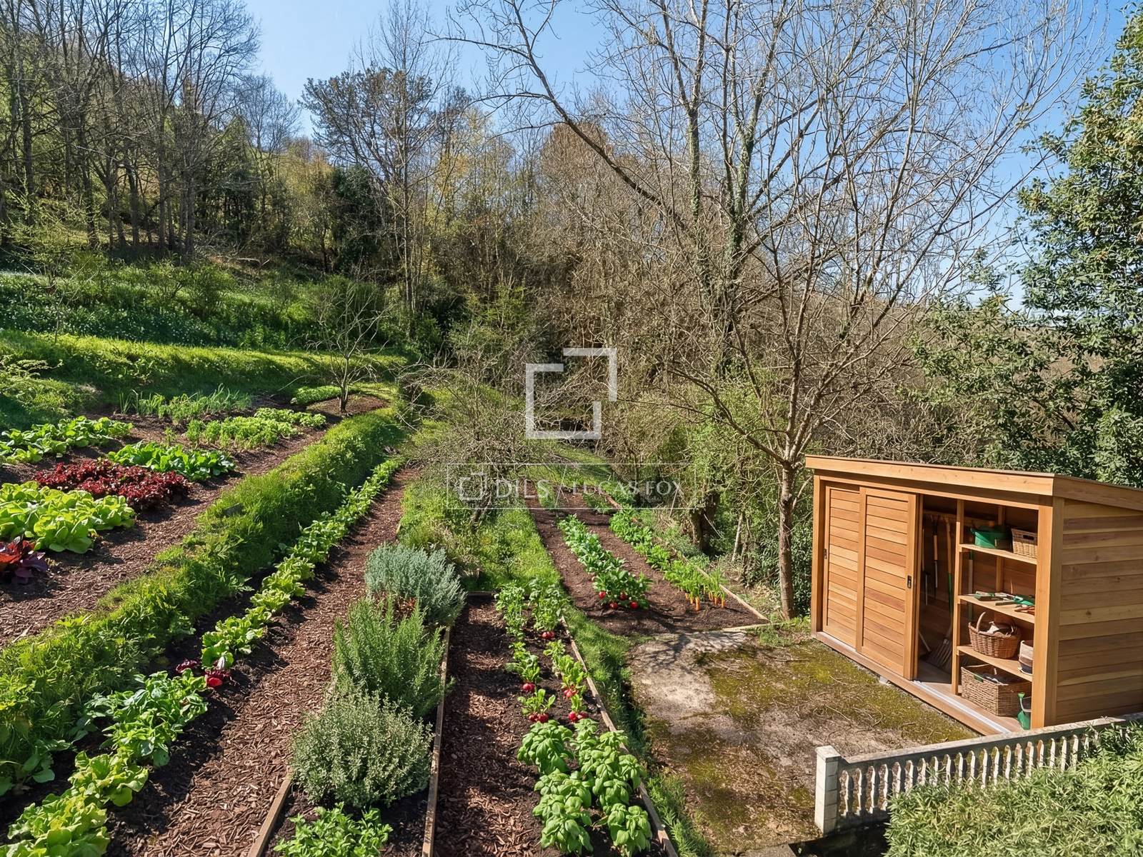 De tuin beschikt over een barbecueplek, een terras, fruitbomen en tuinmeubelen. De tuin heeft een oppervlakte van 1.500 m², op een totale perceeloppervlakte van 6.000 m², wat een serene boswandeling van 5-10 minuten oplevert.