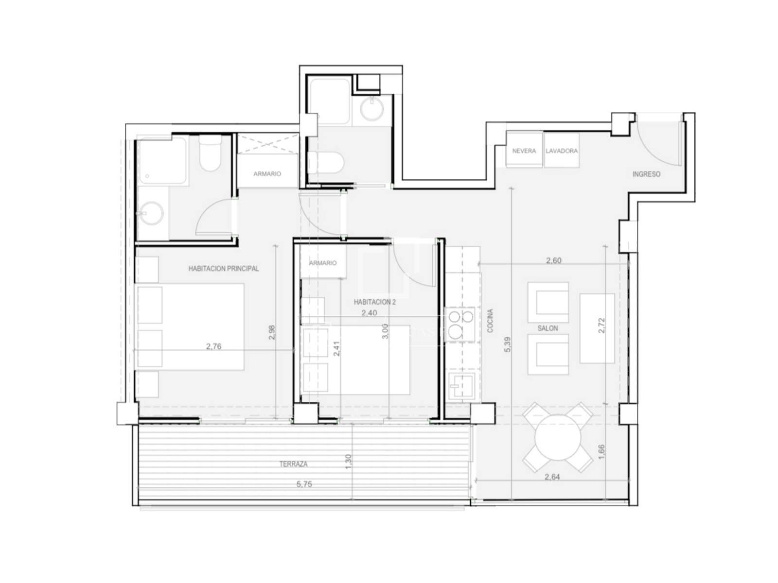 Woonkamer, keuken, 2 slaapkamers, 2 badkamers en terras.