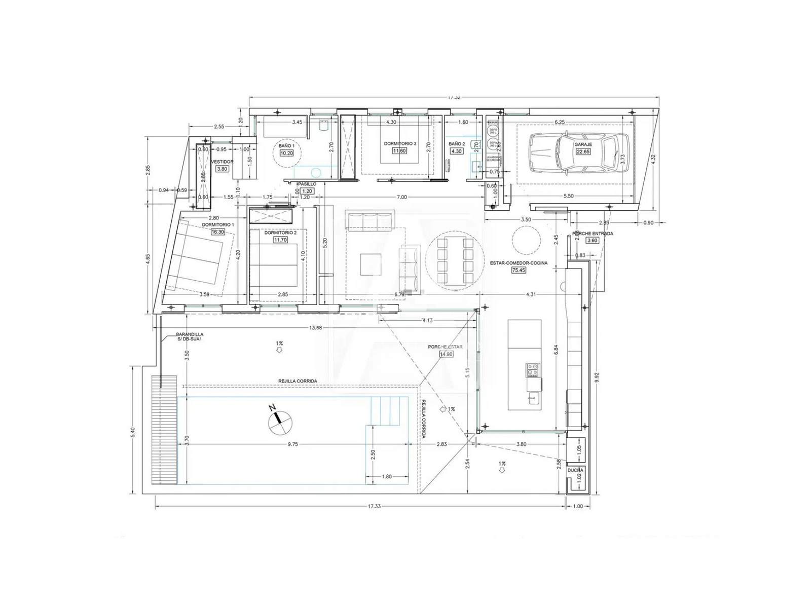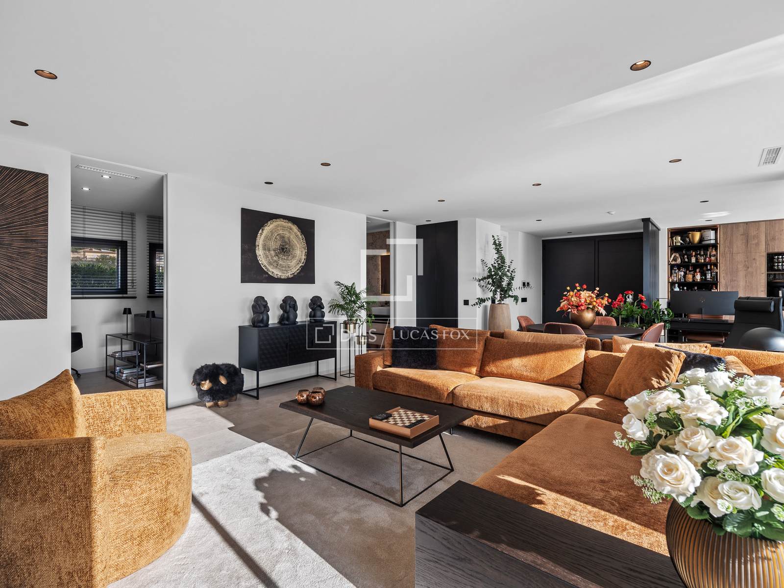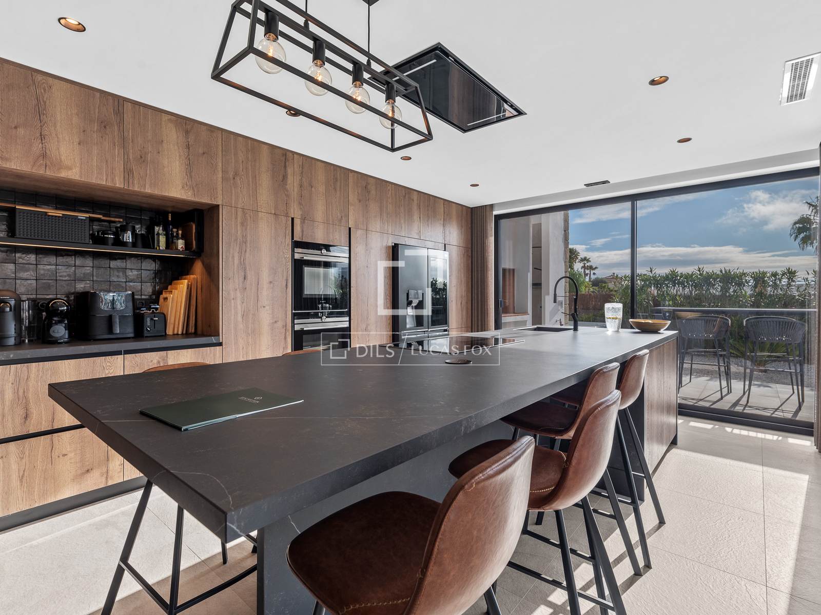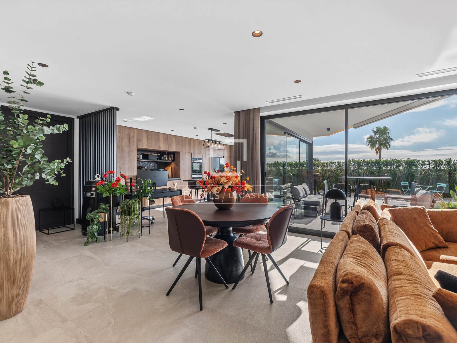 De begane grond bestaat uit drie ruime slaapkamers en twee complete badkamers, waarvan één en-suite bij de hoofdslaapkamer, die tevens een kleedkamer heeft. Het hart van de woning is de spectaculaire woon-eetkamer met een geïntegreerde keuken en een groot kookeiland. Deze open ruimte van meer dan 75 m² is ontworpen om zowel van het dagelijks leven als van sociale bijeenkomsten te genieten, met grote ramen die direct toegang bieden tot de terrassen en de buitenruimte.