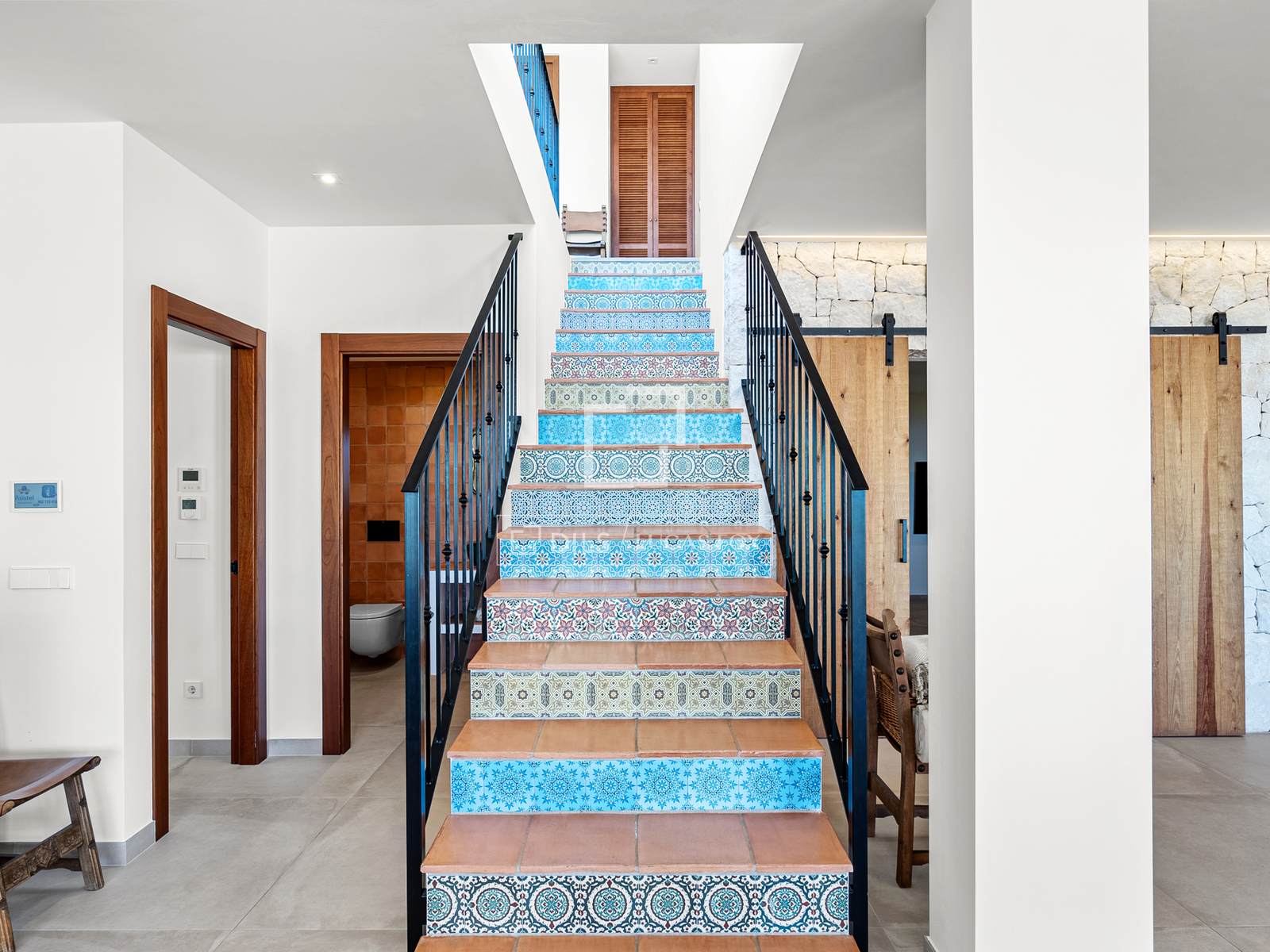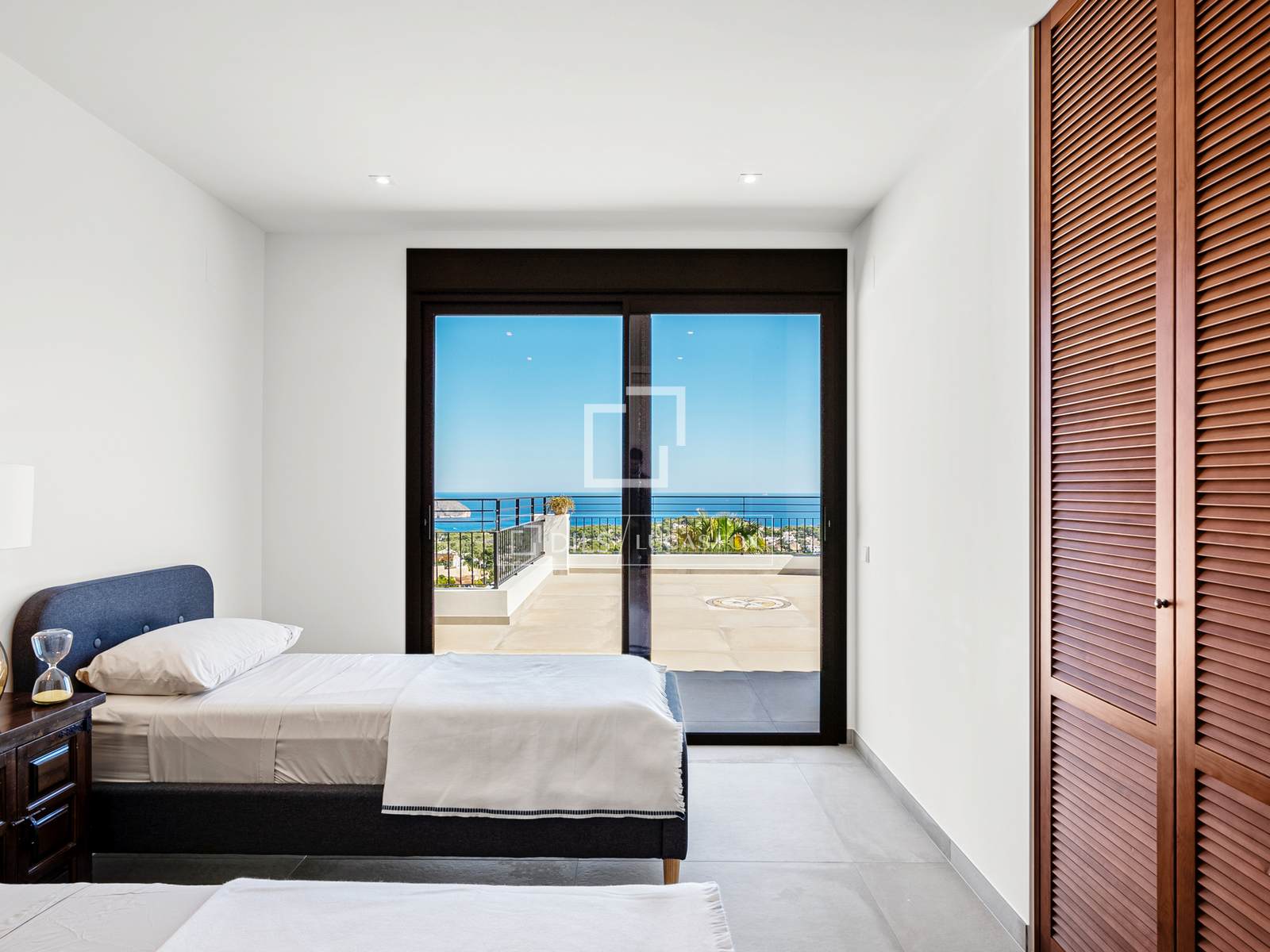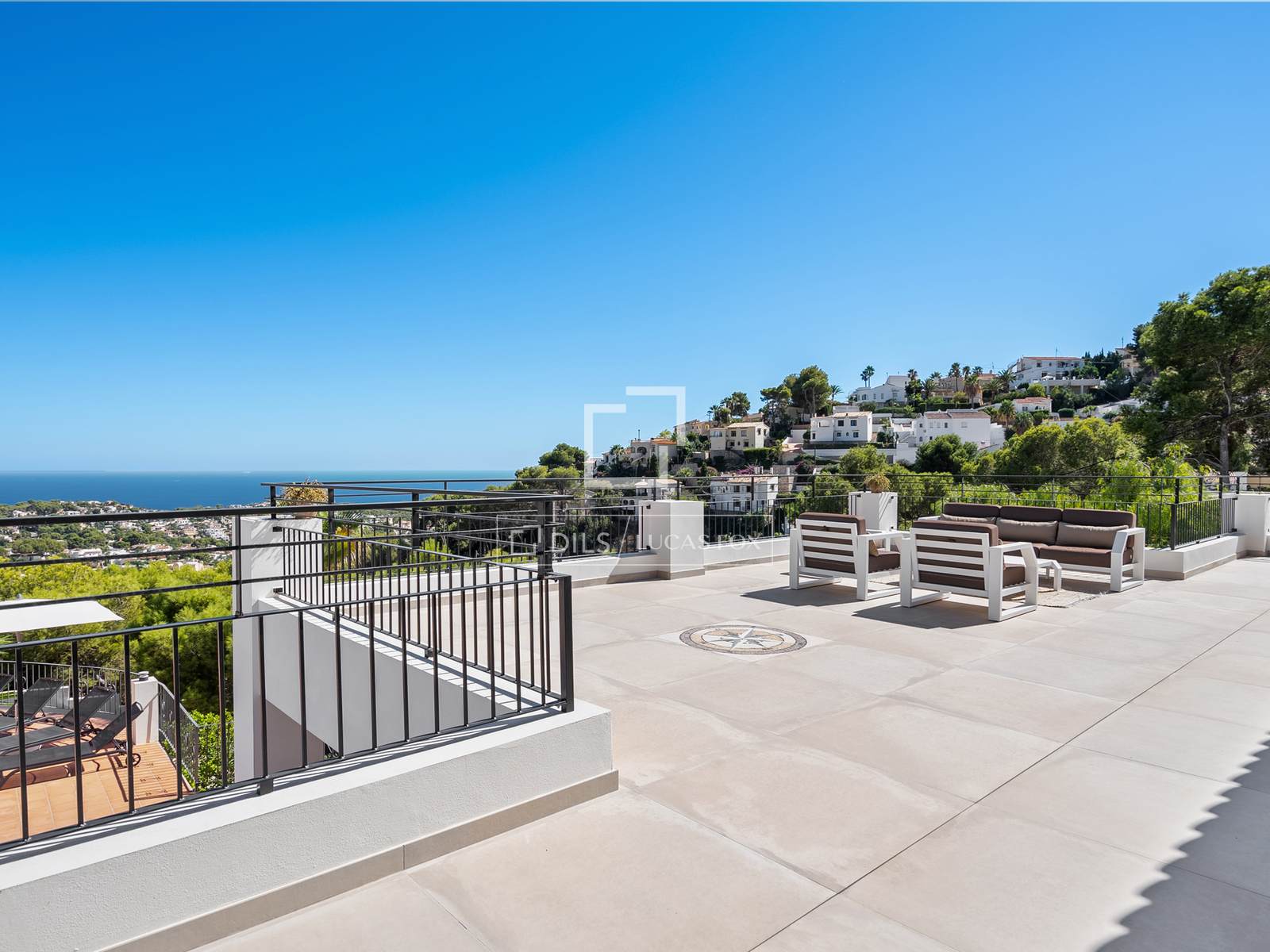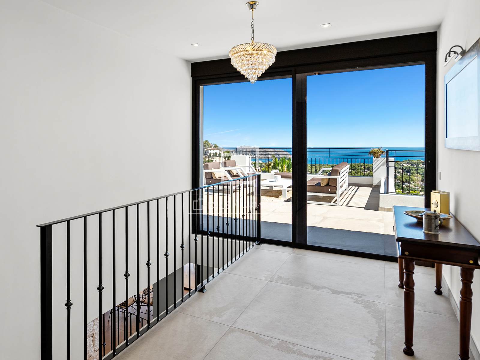 De bovenverdieping beschikt over drie slaapkamers: een master bedroom met een elegante en-suite badkamer en twee extra tweepersoonsslaapkamers die een grote, moderne badkamer delen. Alle kamers en de hal komen direct uit op een indrukwekkend terras van 100 m² – een ideale plek voor een kop koffie in de ochtend, om te zonnebaden of gezellig samen te zijn met vrienden, terwijl u geniet van de eindeloze licht- en kleurwisselingen boven de Middellandse Zee. Op deze verdieping bevindt zich tevens een aparte wasruimte en een trap naar de benedenverdieping.