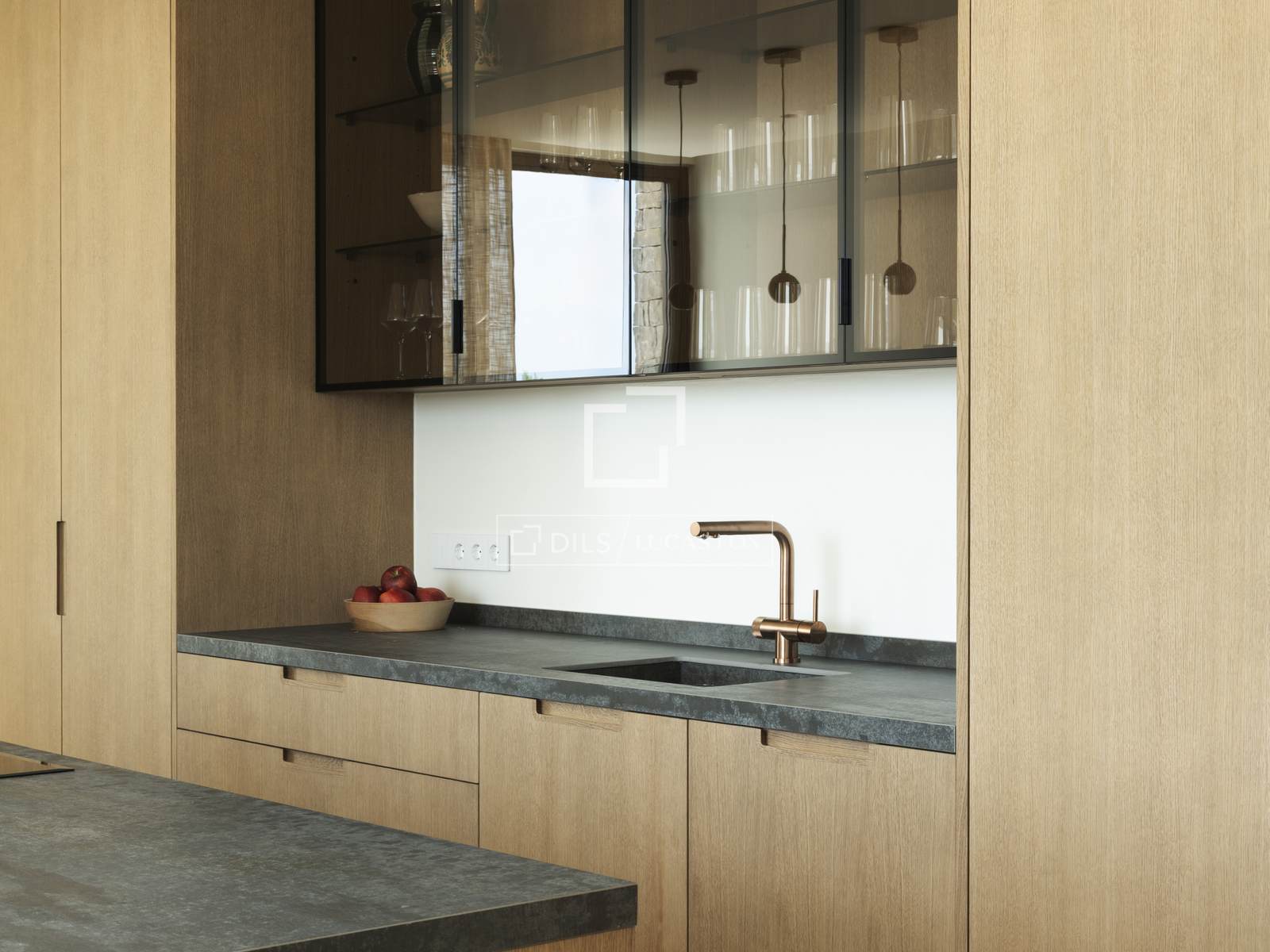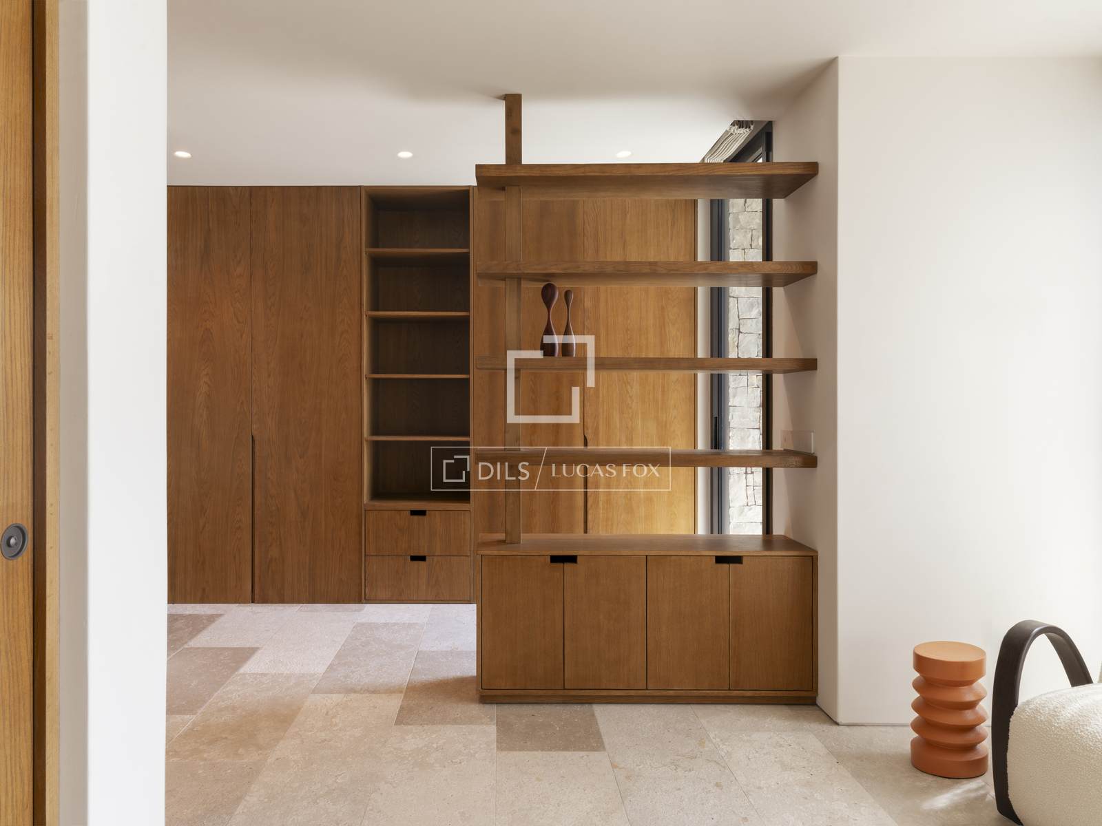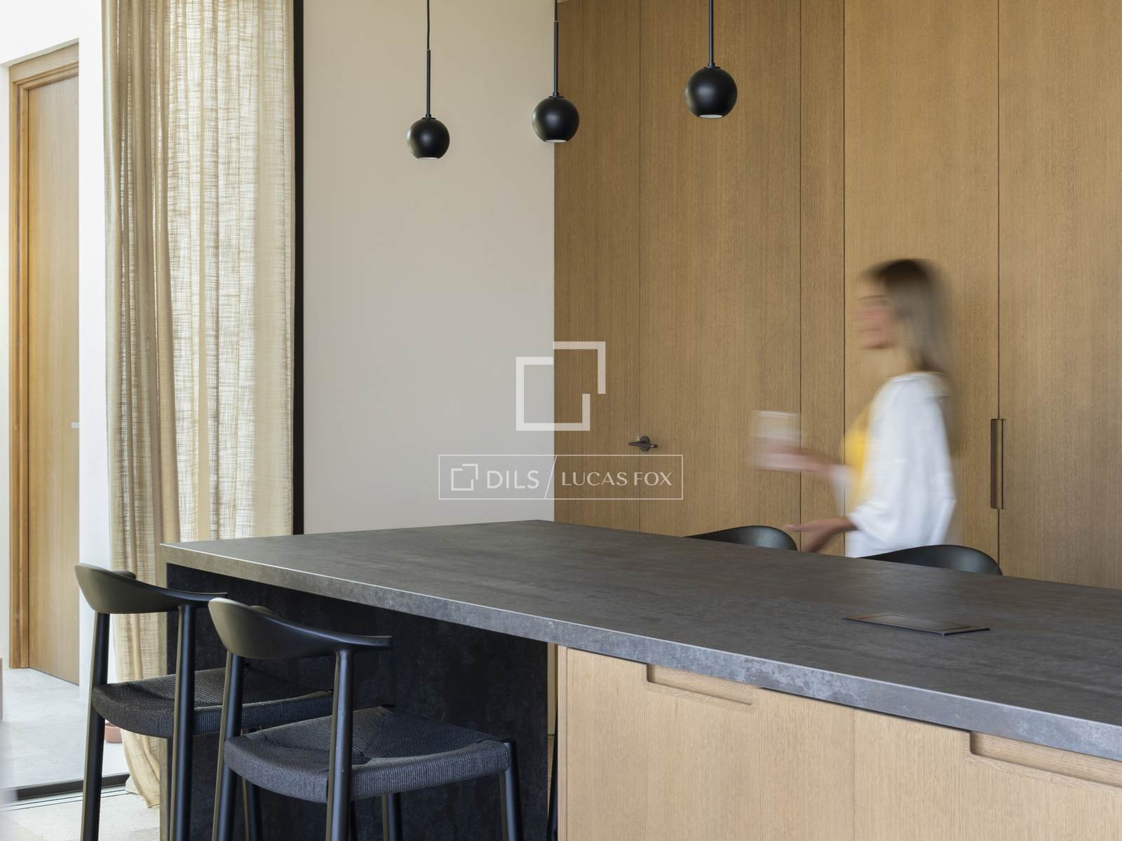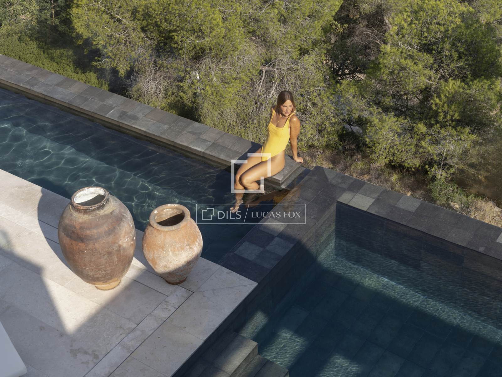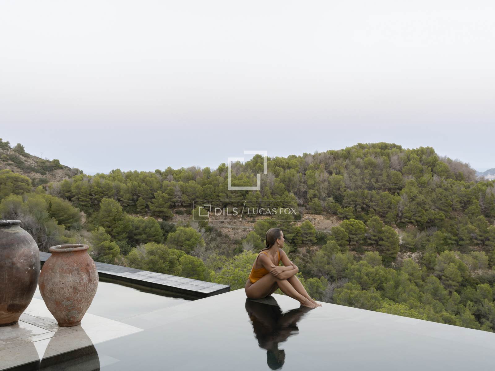 De open keuken, afgewerkt met natuurlijke materialen, loopt naadloos over in de woon- en eetkamer en leidt naar een overloopzwembad dat de lucht en de bergen over de gehele gevel weerspiegelt. Buitenleven nodigt uit tot lange lunches, rustige ochtenden, aperitiefjes bij zonsondergang en avonden met een verkoelend zeebriesje.