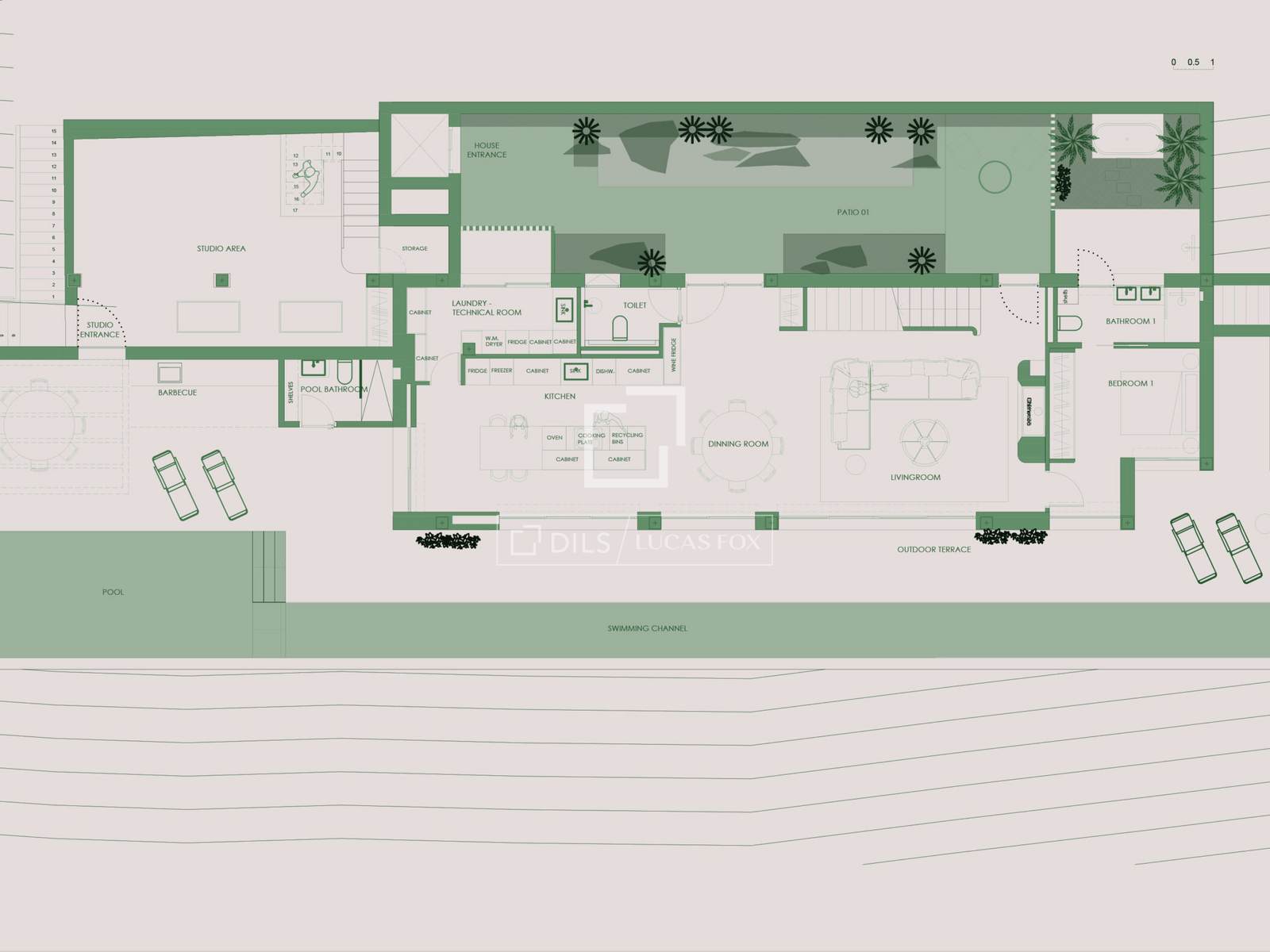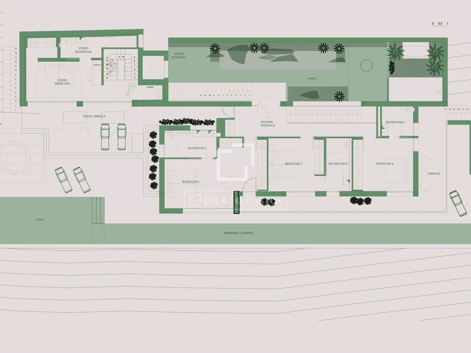 Met een woonoppervlakte van 380 m² biedt het hoofdhuis vier slaapkamers met eigen badkamer, elk ontworpen als een privétoevluchtsoord. Een apart gastenverblijf met eigen slaapkamer, badkamer en directe toegang tot het lager gelegen terras biedt privacy en comfort voor familie, vrienden of personeel.