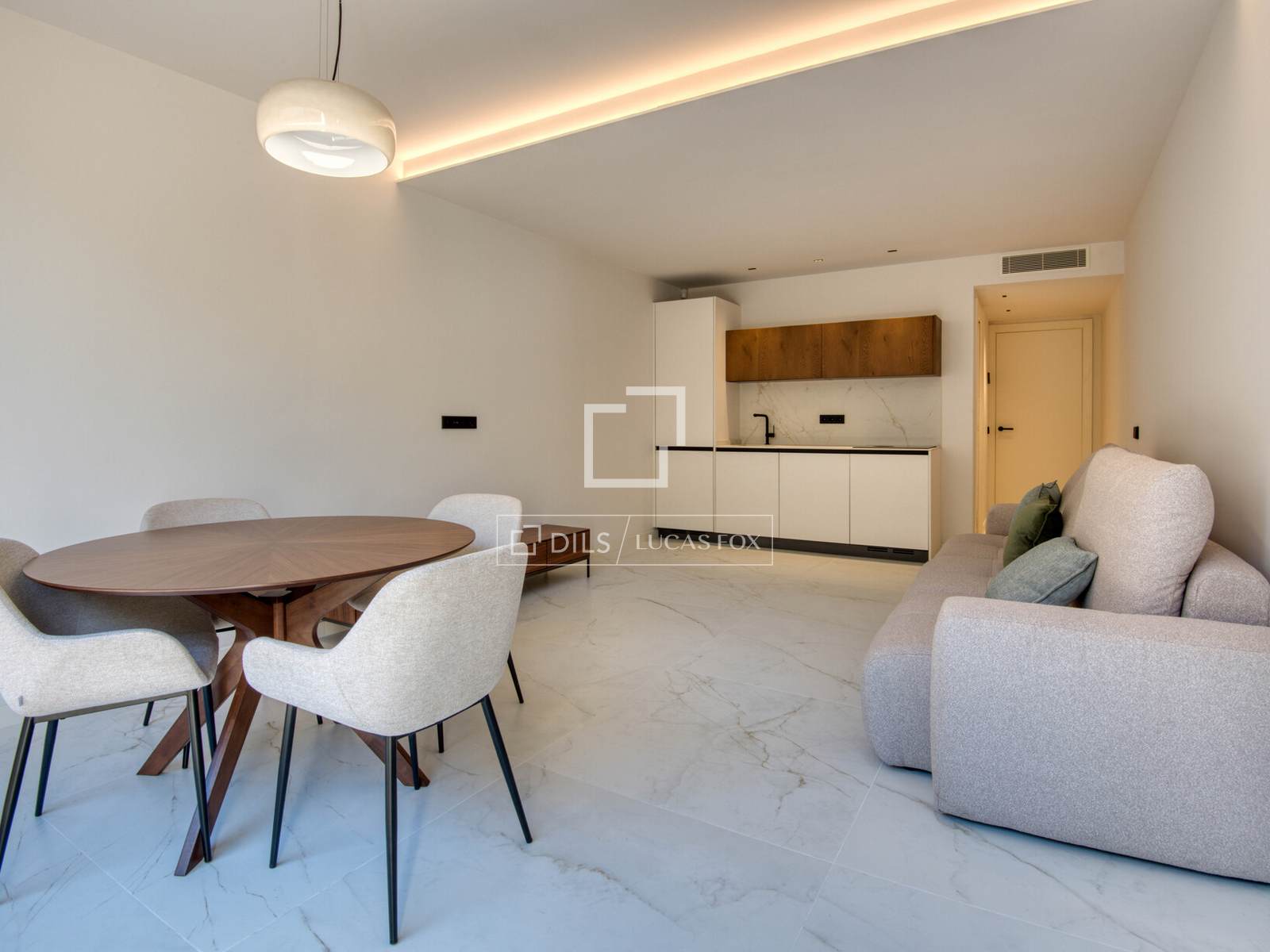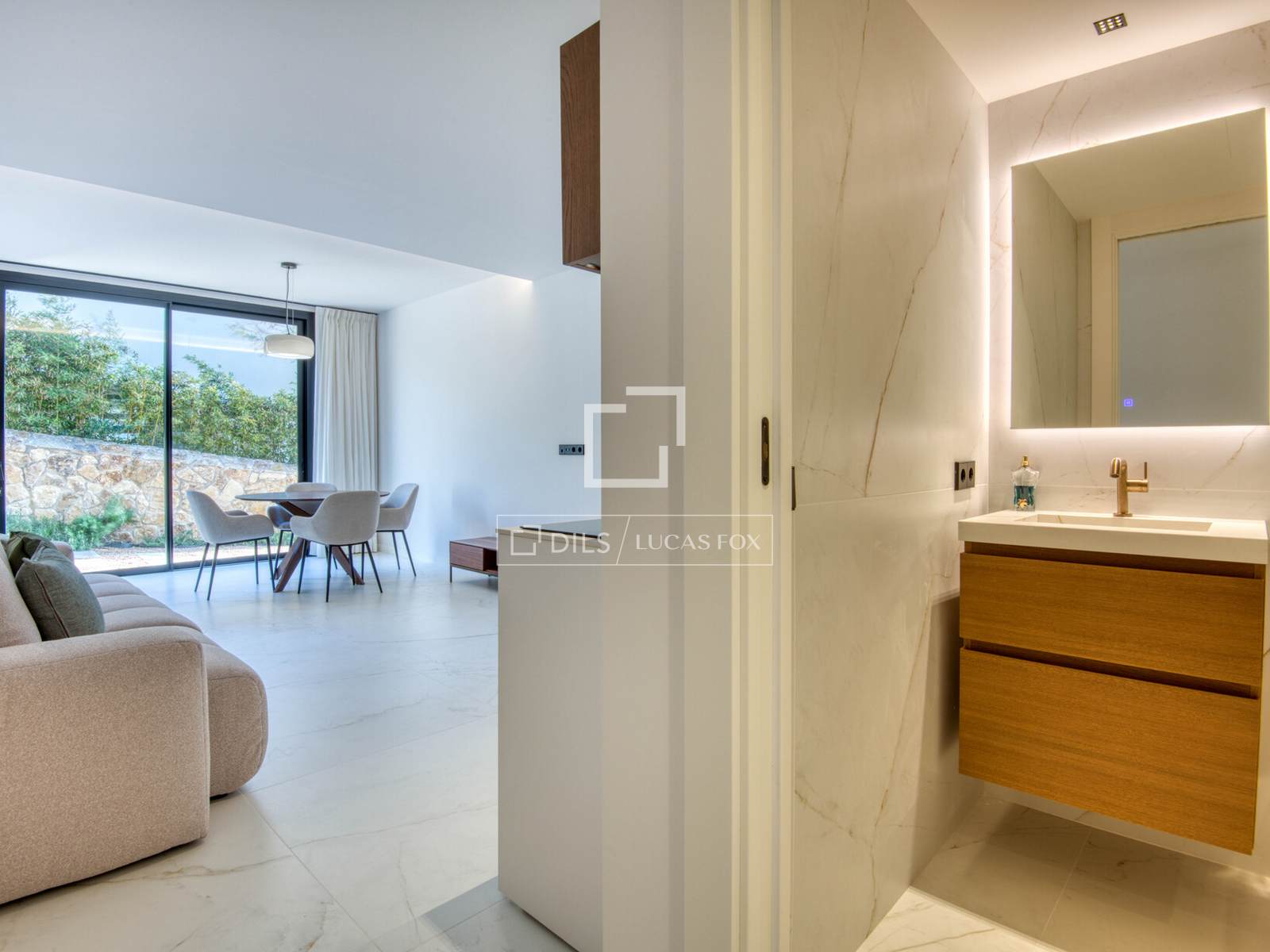 De hoofdingang op de eerste verdieping verwelkomt u met een ruime hal, een gastentoilet en een tweepersoonsslaapkamer. Het hoogtepunt van deze verdieping is een grote en elegante woon-eetkamer met directe toegang tot een royaal terras met uitzicht op zee, perfect om gasten te ontvangen. Een volledig uitgeruste, hoogwaardige keuken completeert deze verdieping.