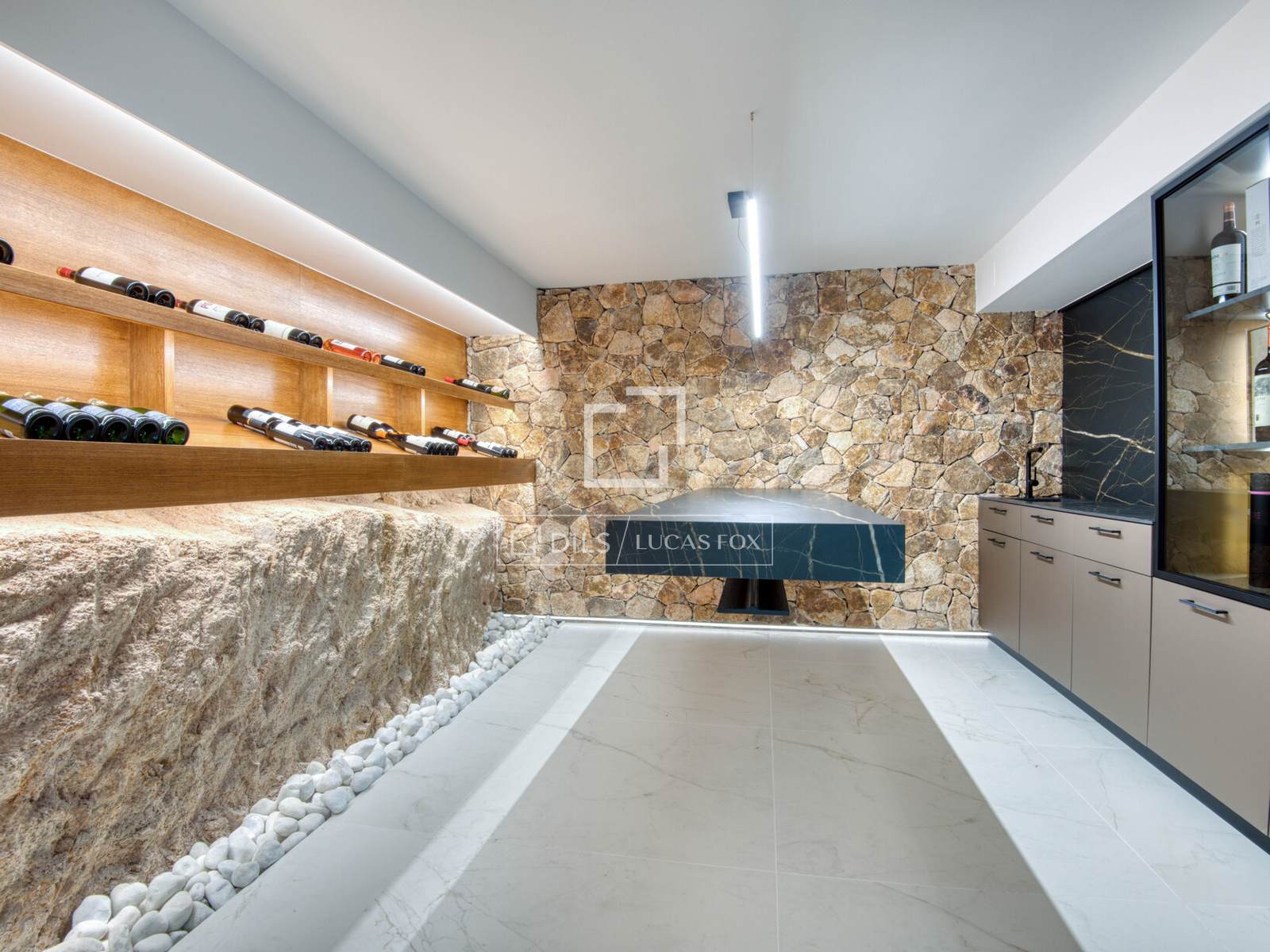 De benedenverdieping van deze prachtige villa beschikt over een zelfstandig gasten- of personeelsappartement met eigen ingang, bestaande uit een woonkamer, een volledig uitgeruste keuken, een slaapkamer met tweepersoonsbed en een badkamer. Daarnaast biedt deze verdieping een gastentoilet, een ruime zomerwoonkamer met een ingerichte keuken en directe toegang tot de tuin en het zwembad, allemaal met een prachtig uitzicht op zee. Een elegante wijnkelder completeert deze verdieping.