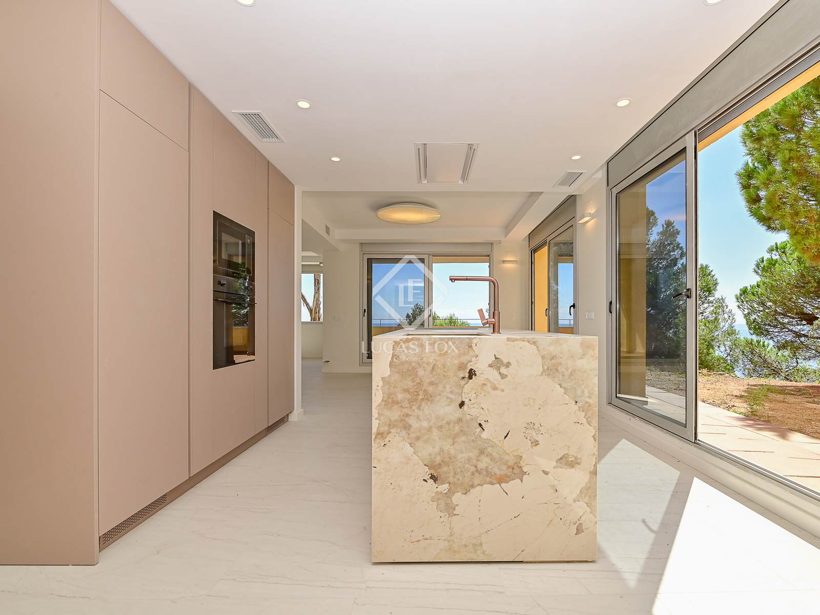 Binnen is de villa verdeeld over drie verdiepingen, verbonden door een trap. Een lift is reeds geïnstalleerd. Op de begane grond bevindt zich de centrale ruimte met een ruime woon- en eetkamer, met kamerhoge ramen die direct uitkijken op het terras en het zwembad. De aparte keuken is volledig uitgerust met hoogwaardige apparatuur en heeft ook een wasruimte. Een gastentoilet completeert deze verdieping.