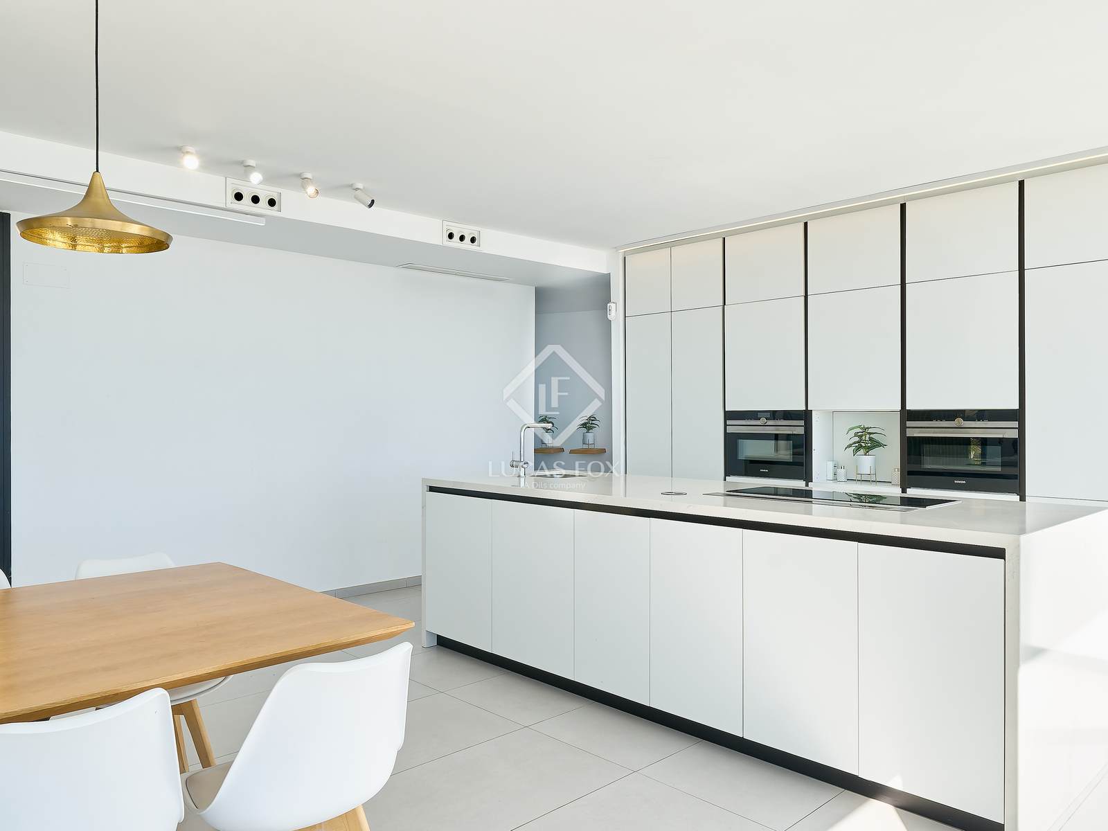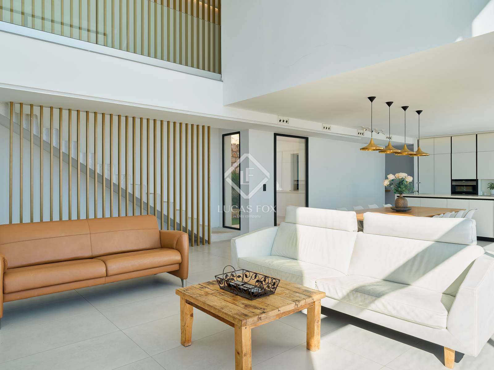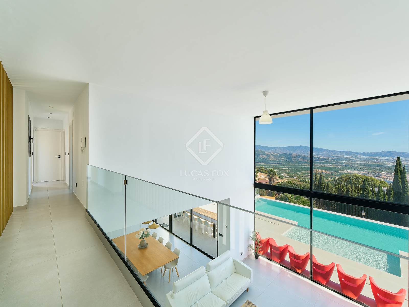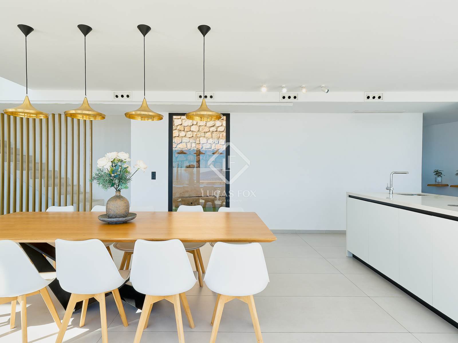 Bij binnenkomst in de woning leidt een elegante hal naar de ruime, open leefruimte met keuken, eetkamer en woonkamer. Grote panoramische ramen bieden uitzicht op het landschap, geven toegang tot de buitenlucht en laten veel natuurlijk licht binnen. De moderne keuken is uitgerust met hoogwaardige apparatuur en op maat gemaakte afwerkingen, met veel oog voor detail.