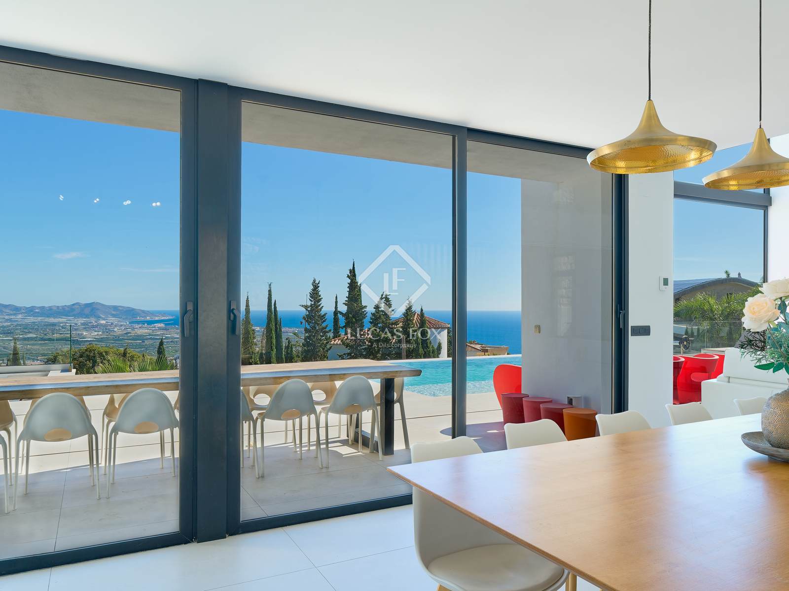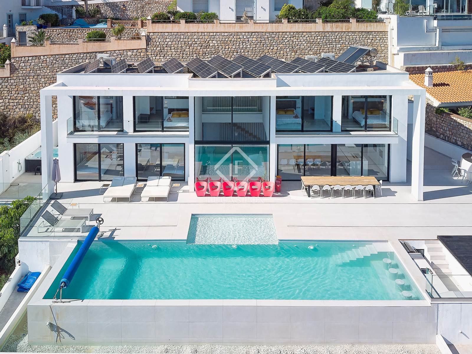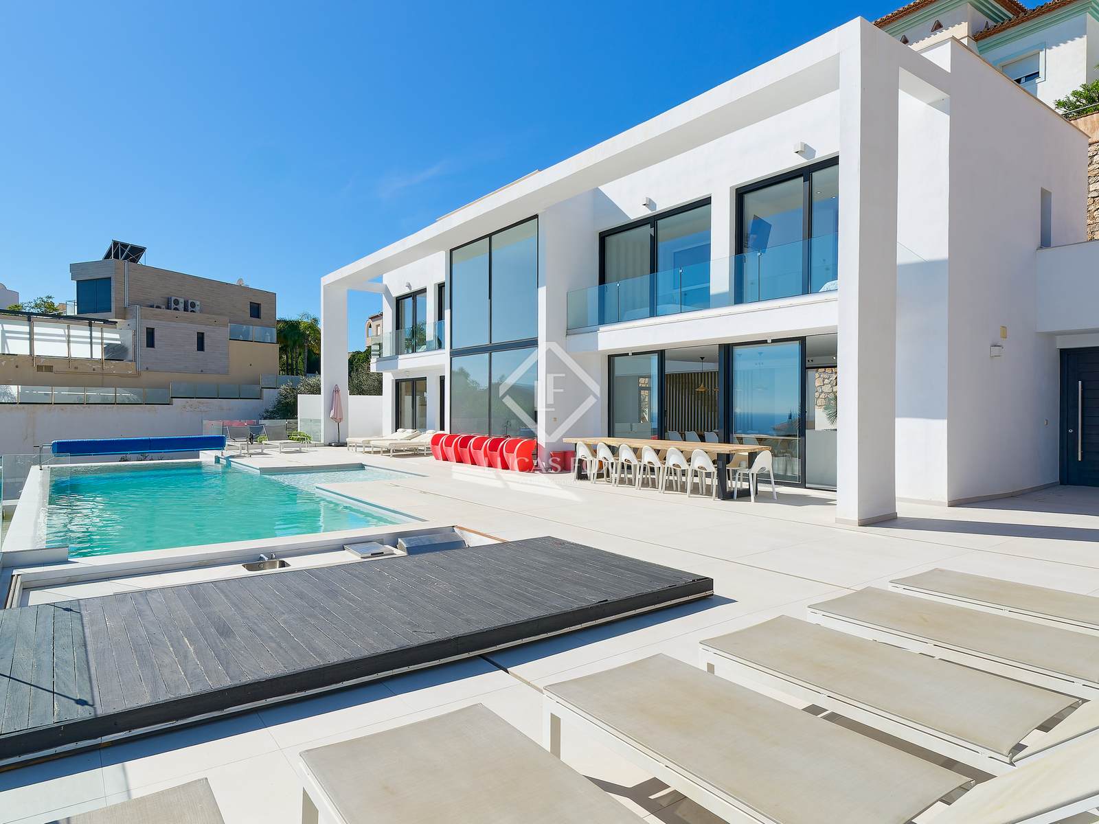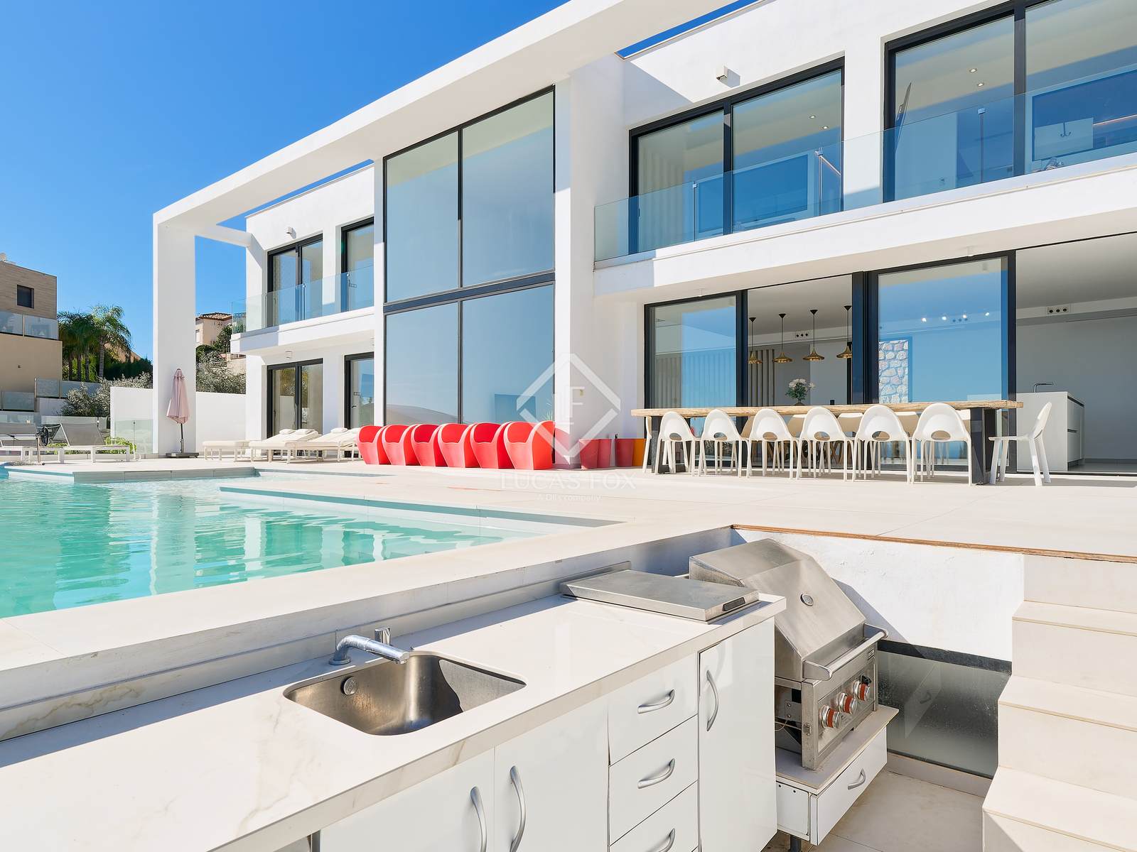 Buiten is er een groot terras met een spectaculair verwarmd infinity zwembad met een bar in het water, een volledig uitgeruste buitenkeuken en een chill-outruimte, ideaal om het hele jaar door te genieten van het klimaat en het uitzicht op de Middellandse Zee. Aan de ene kant is er een jacuzzi om te ontspannen, terwijl aan de achterkant een buitenspeelplaats is ontworpen voor familie-entertainment.