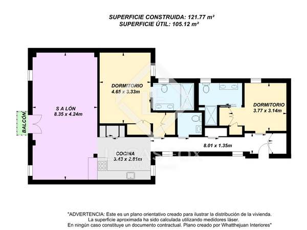 De indeling is geoptimaliseerd voor ruimte en comfort. Het beschikt over drie slaapkamers, waarvan twee met een eigen badkamer, allemaal met uitstekende natuurlijke lichtinval en inbouwkasten. Er is ook een derde badkamer. De woonkamer bestaat uit een lichte woon-/eetkamer met toegang tot een balkon en een volledig uitgeruste moderne keuken met inbouwapparatuur.