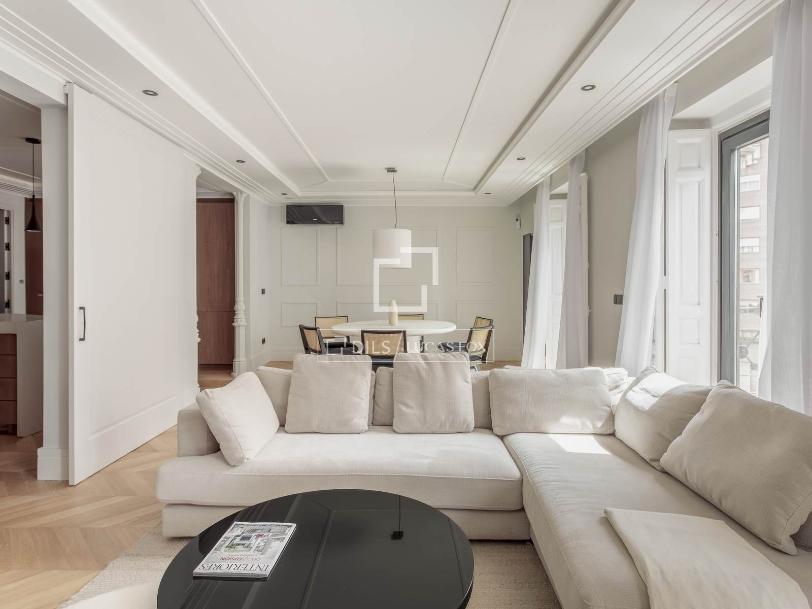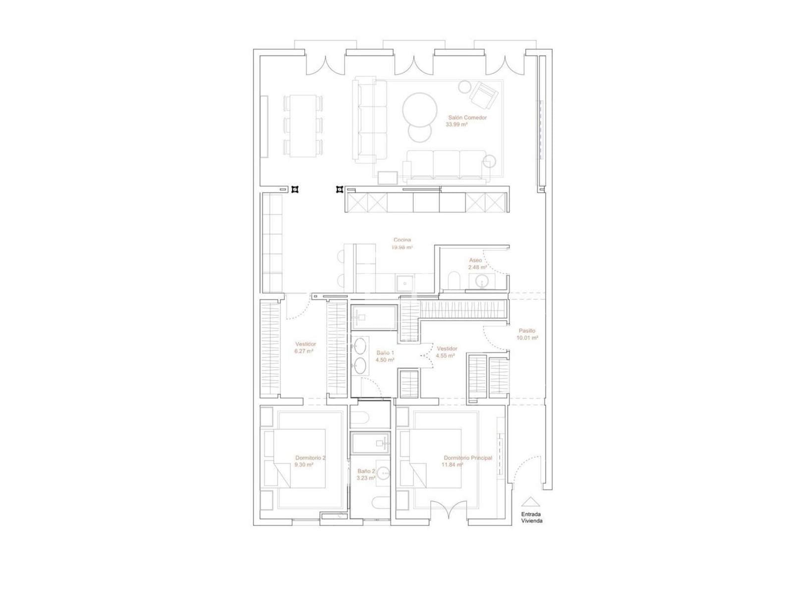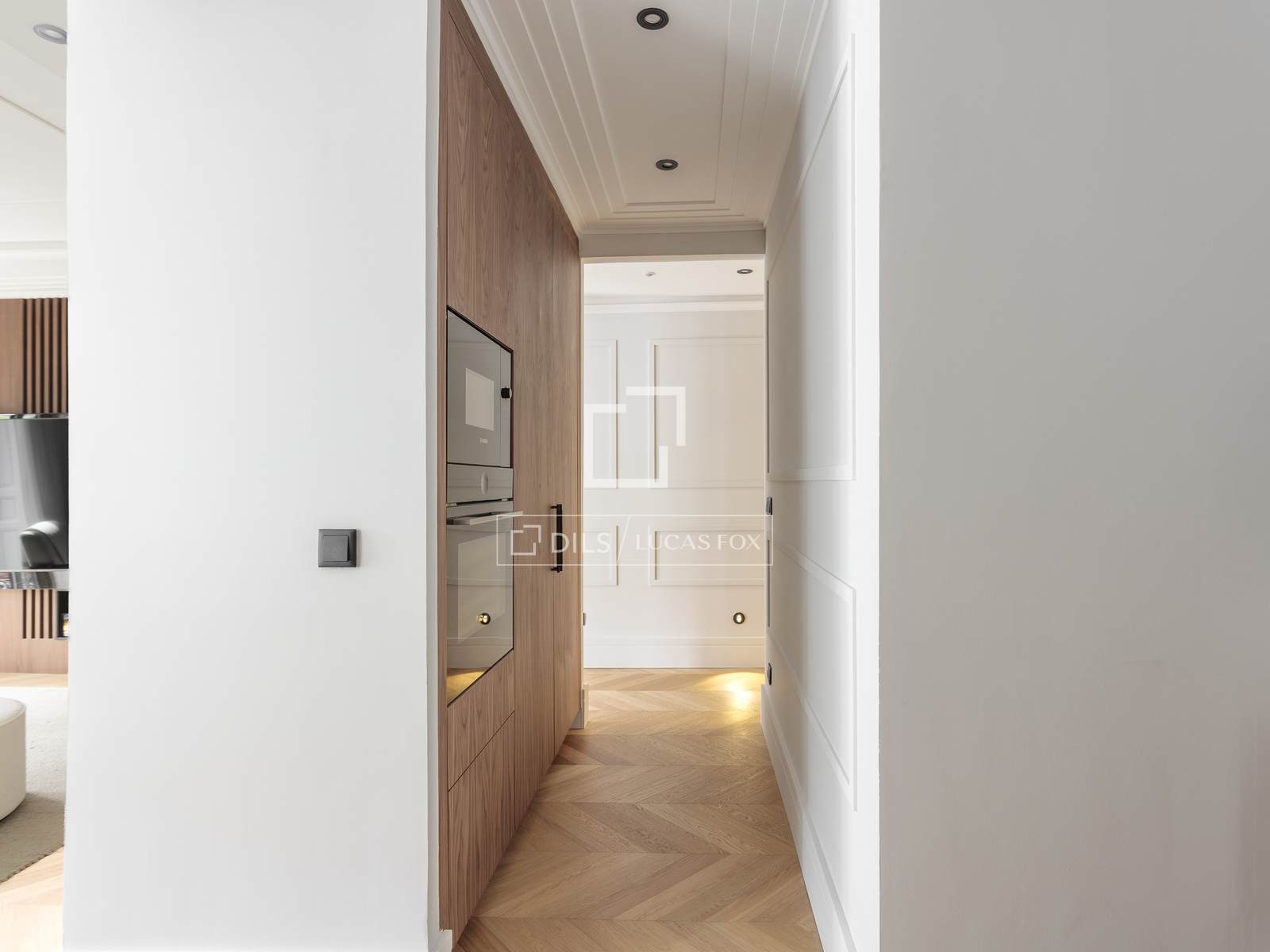 Een van de belangrijkste kenmerken is de ruime woon-eetkamer, die dankzij de uitstekende ligging op het zuiden baadt in een buitengewoon natuurlijk licht. De drie balkons met uitzicht op de straat zorgen niet alleen voor licht, maar ook voor karakter, waardoor het interieur van de woning verbonden wordt met de dynamiek en elegantie van de omgeving. Een ideale ruimte om te ontspannen en gasten te ontvangen in een verfijnde setting.